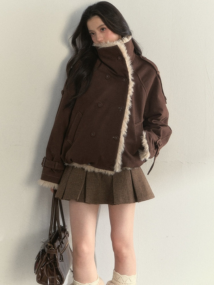 Brown Vintage Double-sided Faux Fur Jacket with Buckle Cuffs