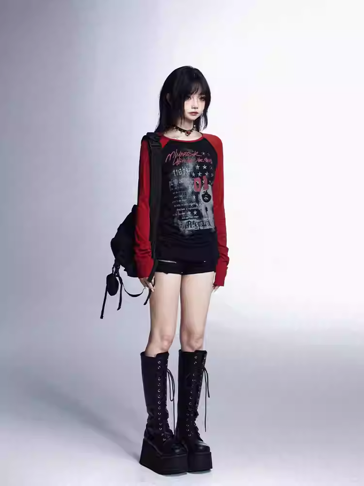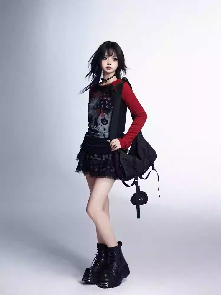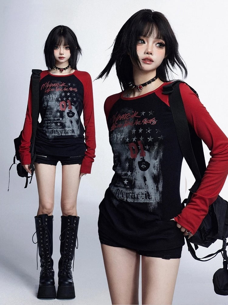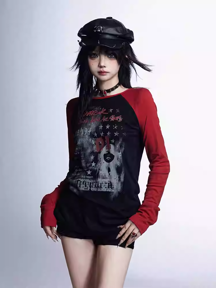 Rot-schwarzes Vintage-Top mit Rundhalsausschnitt und glamouröser Grafik