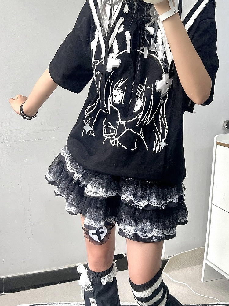 Black&White/Black&Purple Vintage Punk Tiered Skirt with Lace Trim