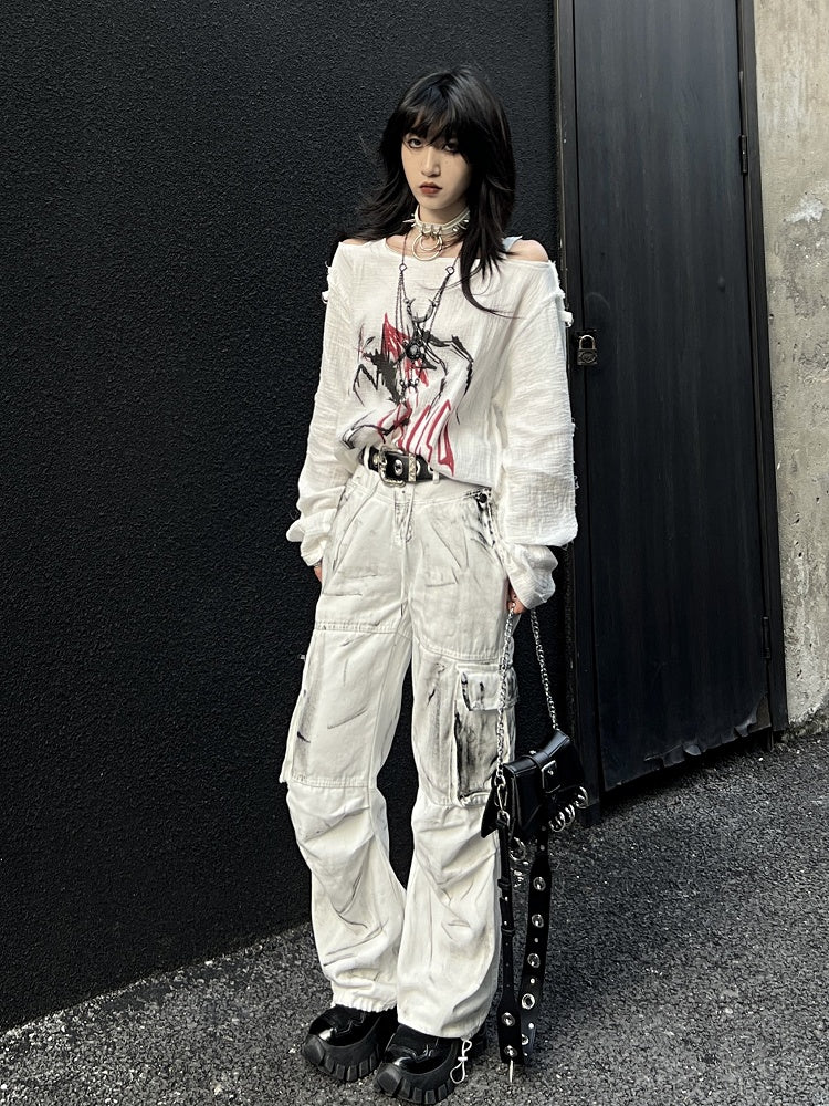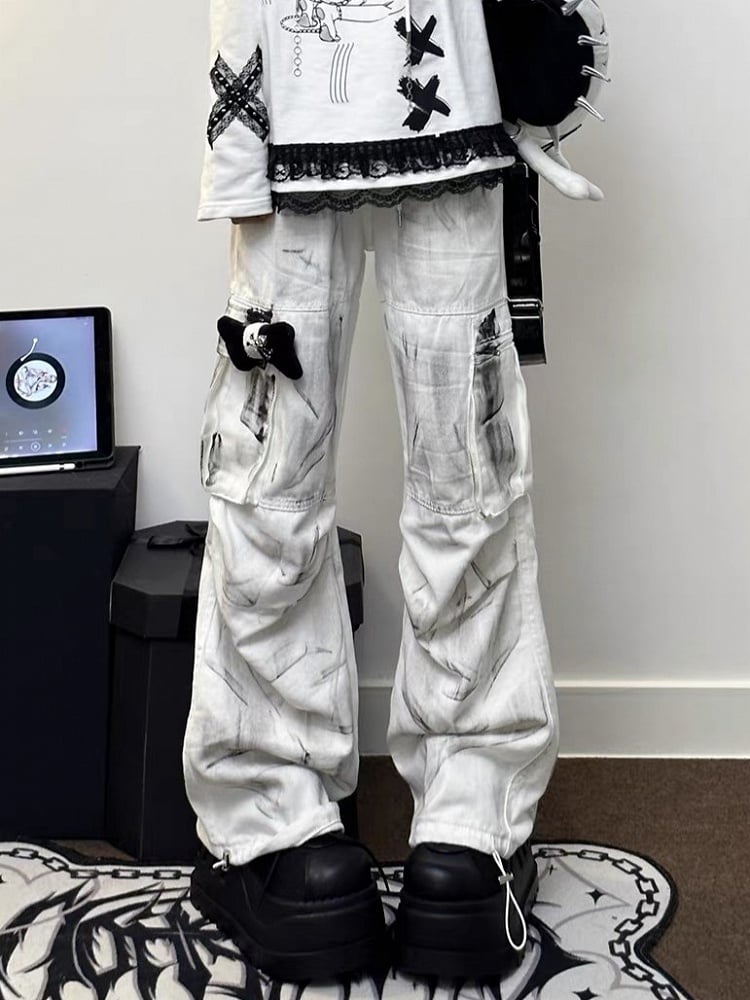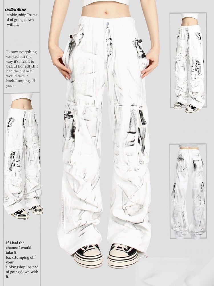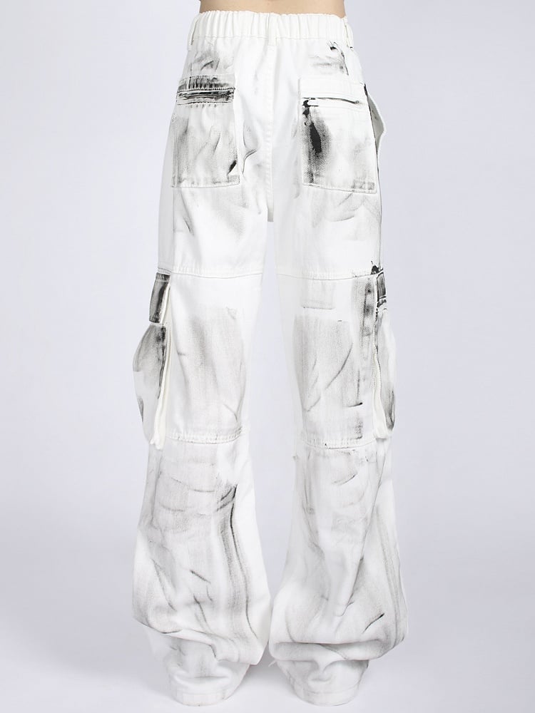 Vintage-Cargojeans in Weiß mit Farbspritzern und Batikmuster, lockere Passform, mit Kordelzug in der Taille