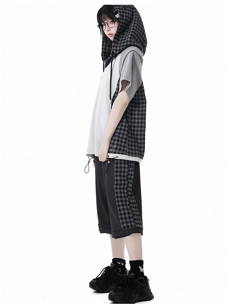 Schwarze karierte Techwear-Hose/Shorts mit Reißverschlussmanschetten und Druckknopfgürtel
