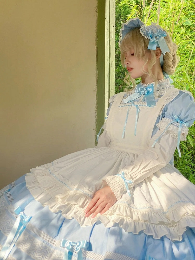 Blau-weißes Old School Lolita Fashion Kleid mit Schleife und Details, JSK-Set