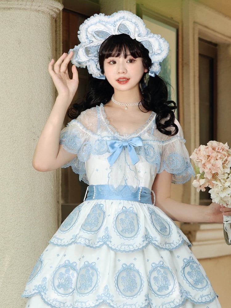 Blau-weißes Old School Lolita Fashion Kleid mit Schleife und Details, JSK-Set