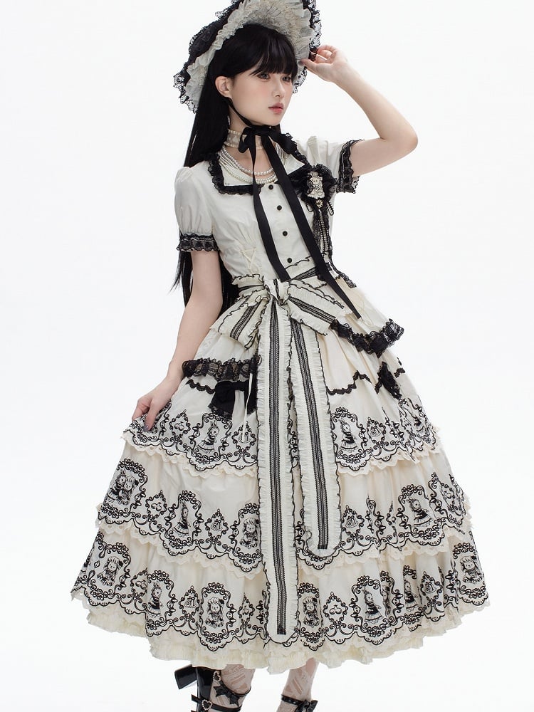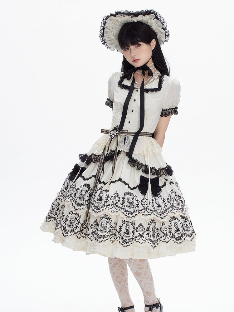 White & Black Puff Sleeves Elegant Lolita Blouse + Layered Scalloped Edge Trim Lolita Skirt with Rabbit Pattern Set