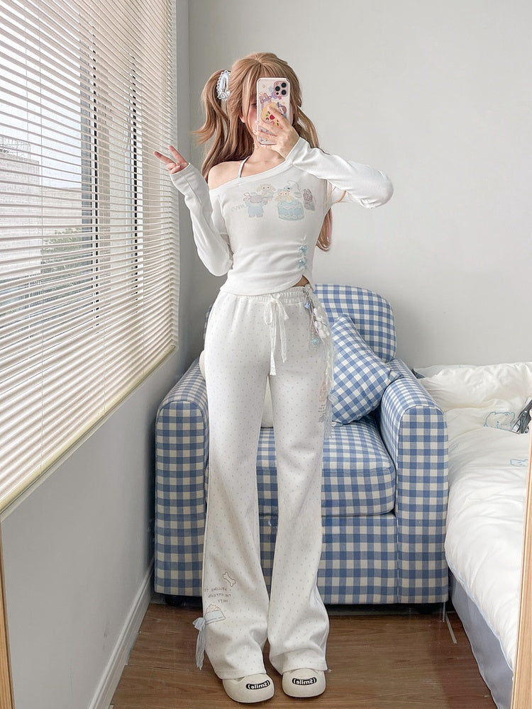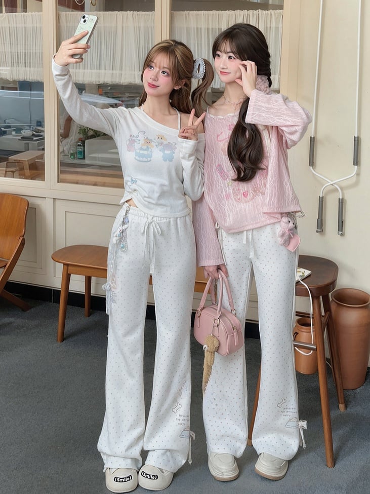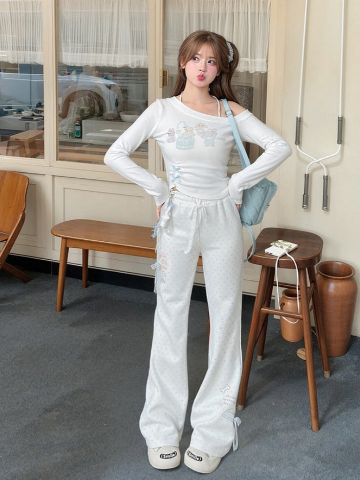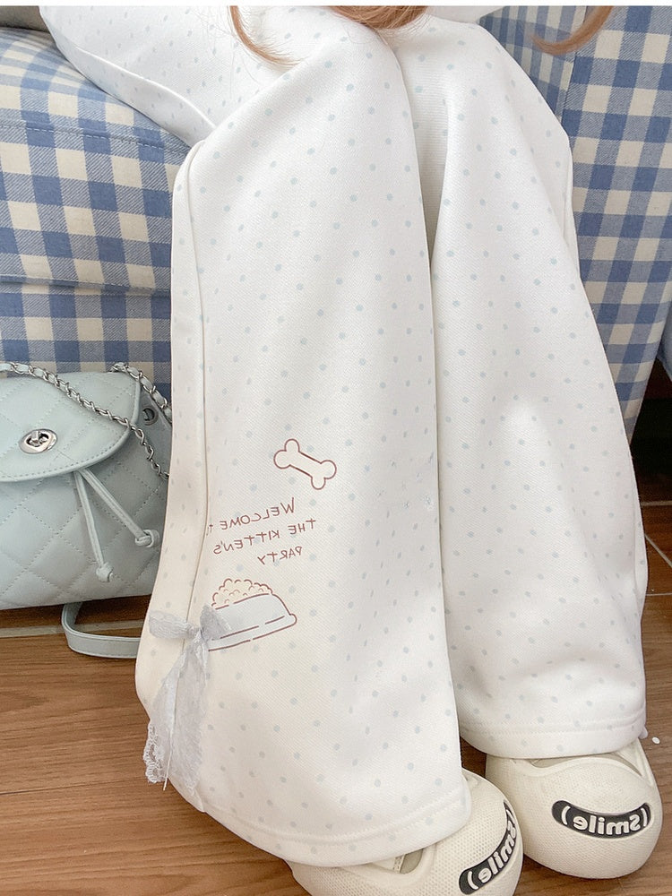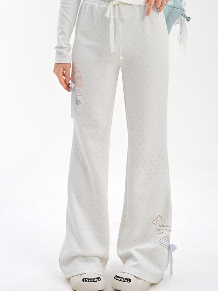 Weiß-blaue Schlaghose, normale/lange Version, gepunktete Spitzenschleife, bezaubernder Kätzchendruck