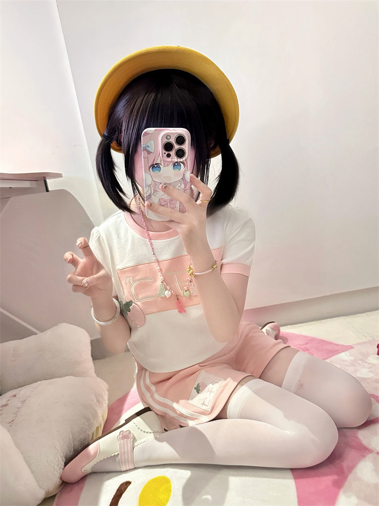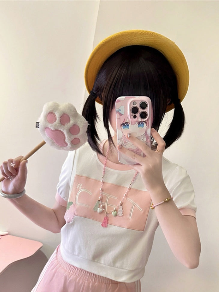 Weißes, kontrastierendes, rosafarbenes Crop-Top mit Rundhalsausschnitt und Erdbeermuster