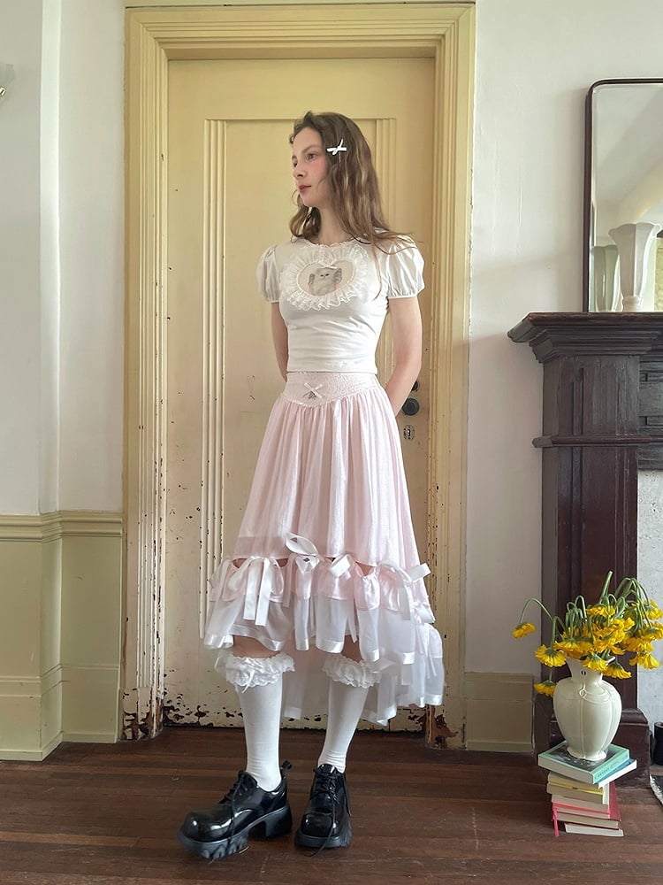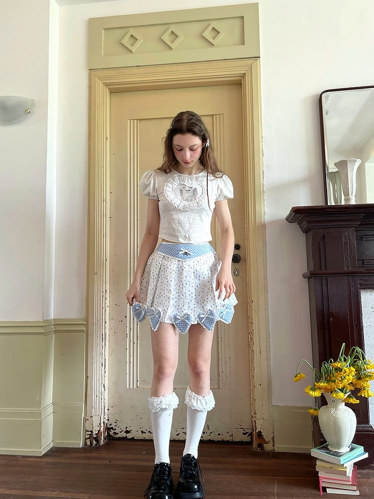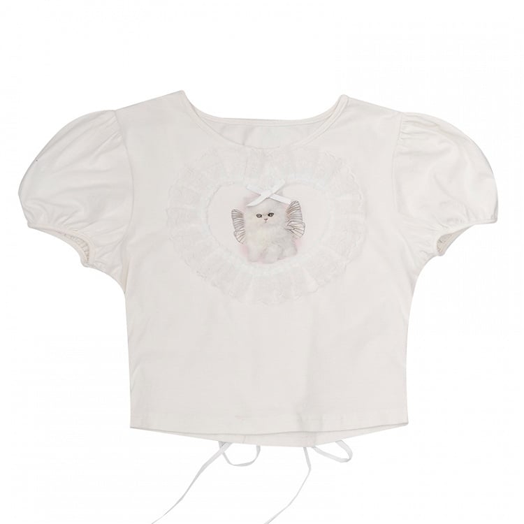 White Cropped Tee with Sweetheart Applique & Cat Print