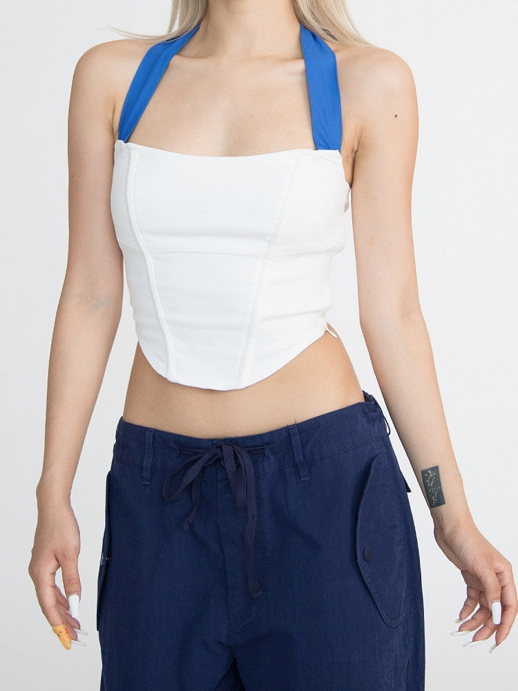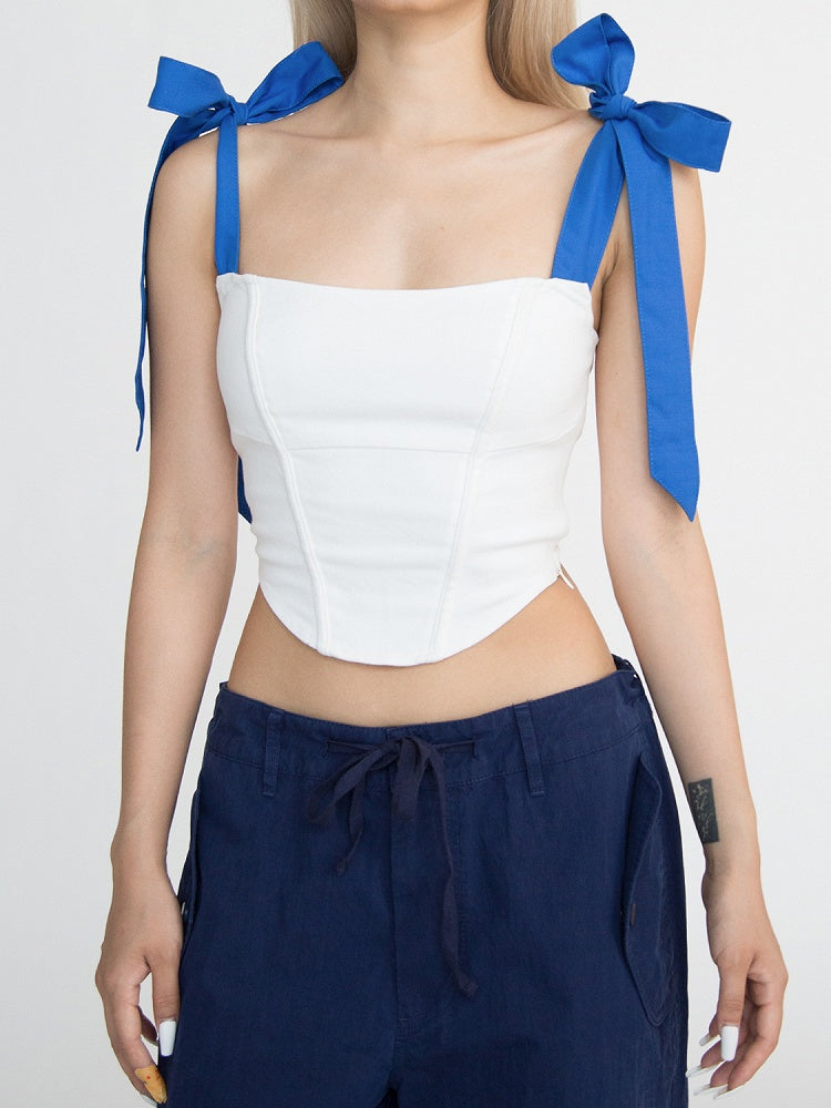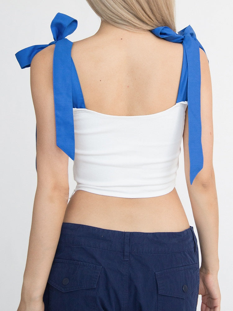 Weißes, ärmelloses Top mit abgerundetem Saum und blauen Trägern zum Selbstbinden