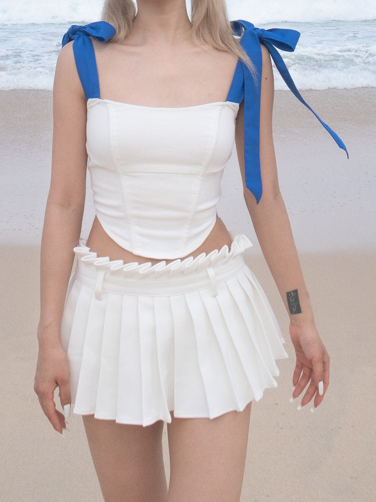 Dieses ärmellose Top ist eine charmante Ergänzung für jede Garderobe. Mit seinem weißen, geschwungenen Saum und den blauen Trägern zum Binden verleiht es jedem Outfit einen Hauch von Glamour. Hergestellt aus hochwertigen Materialien ist es bequem und stilvoll zugleich. Perfekt für jeden Anlass – in diesem Top sehen Sie einfach toll aus und fühlen sich auch so.