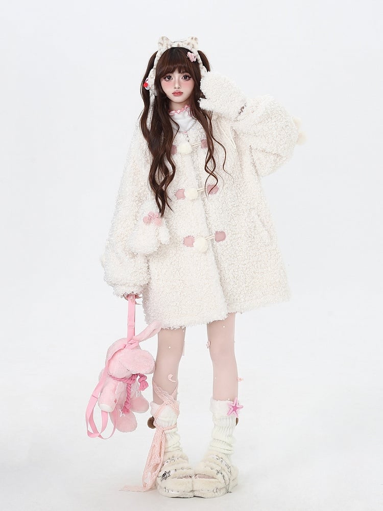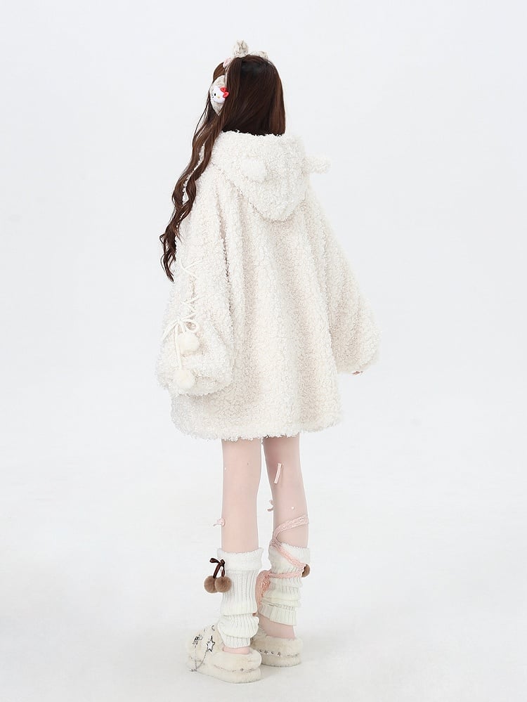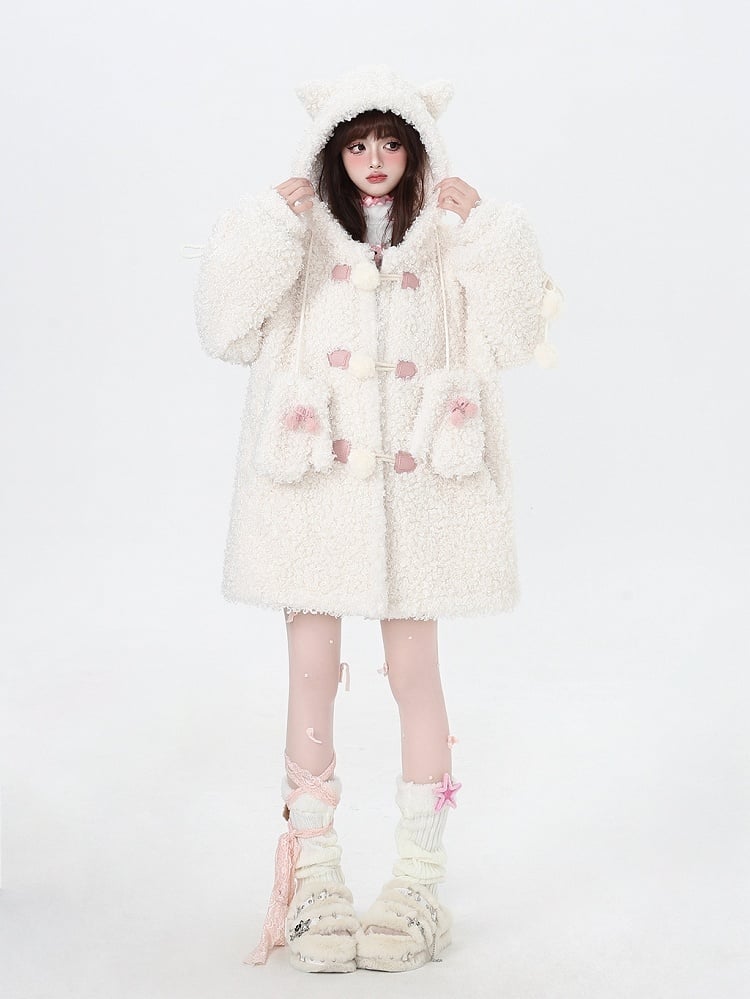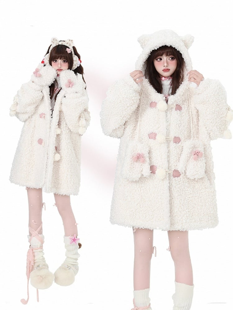 Weißer, süßer, dicker Kapuzenmantel mit Katzenohren und kostenlosen Handschuhen