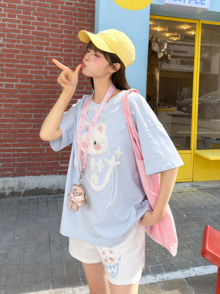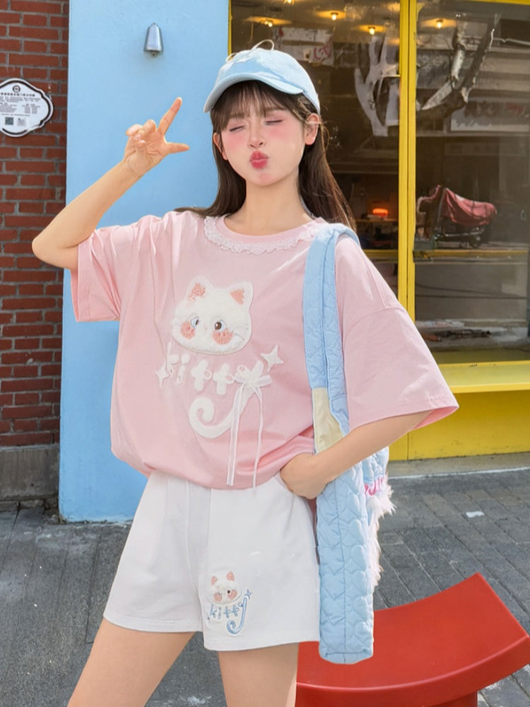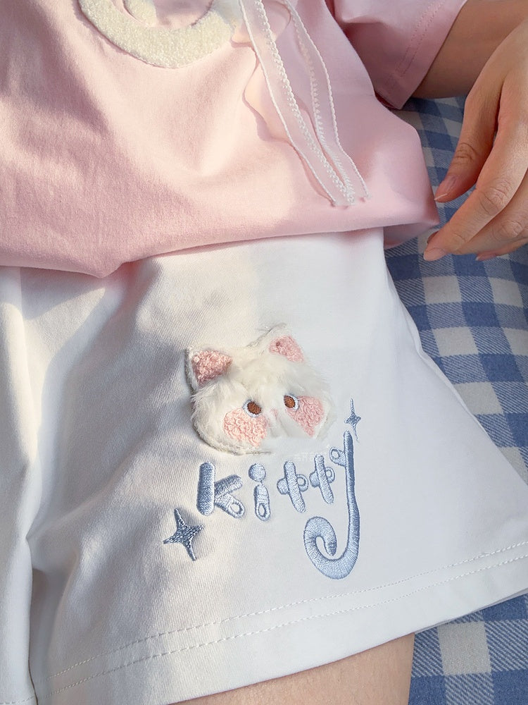 Weiße Freizeitshorts mit elastischer Taille und Kätzchen-Applikation