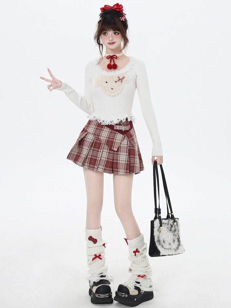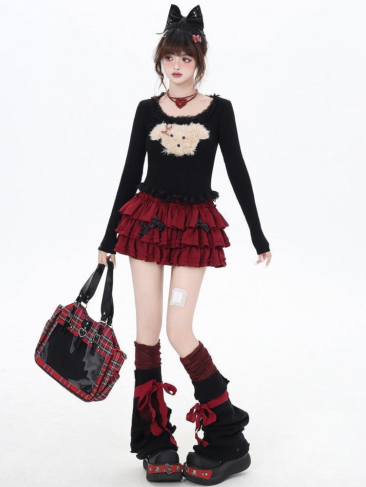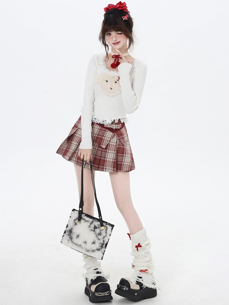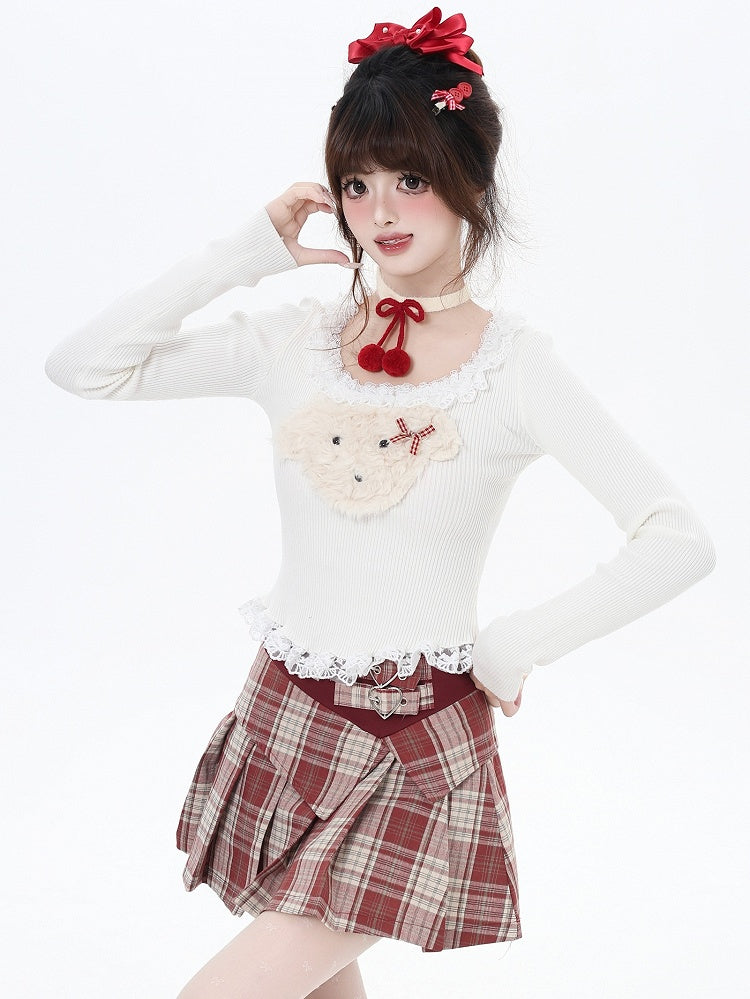 Dieses süße Oberteil besticht durch eine süße Plüsch-Welpen-Applikation und zarten Spitzenbesatz für einen bezaubernden Touch. Weicher Strickstoff in Weiß, Grau und Schwarz sorgt für Komfort und Vielseitigkeit. Perfekt, um jedem Outfit eine charmante Note zu verleihen.