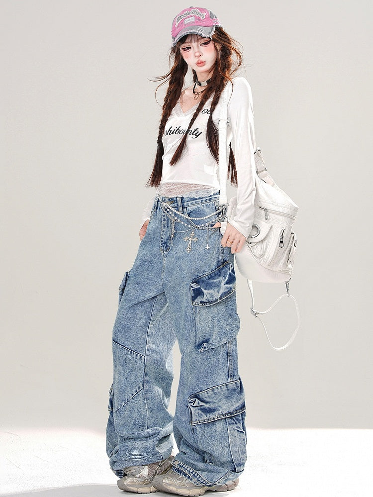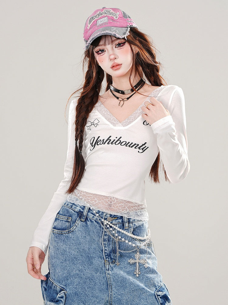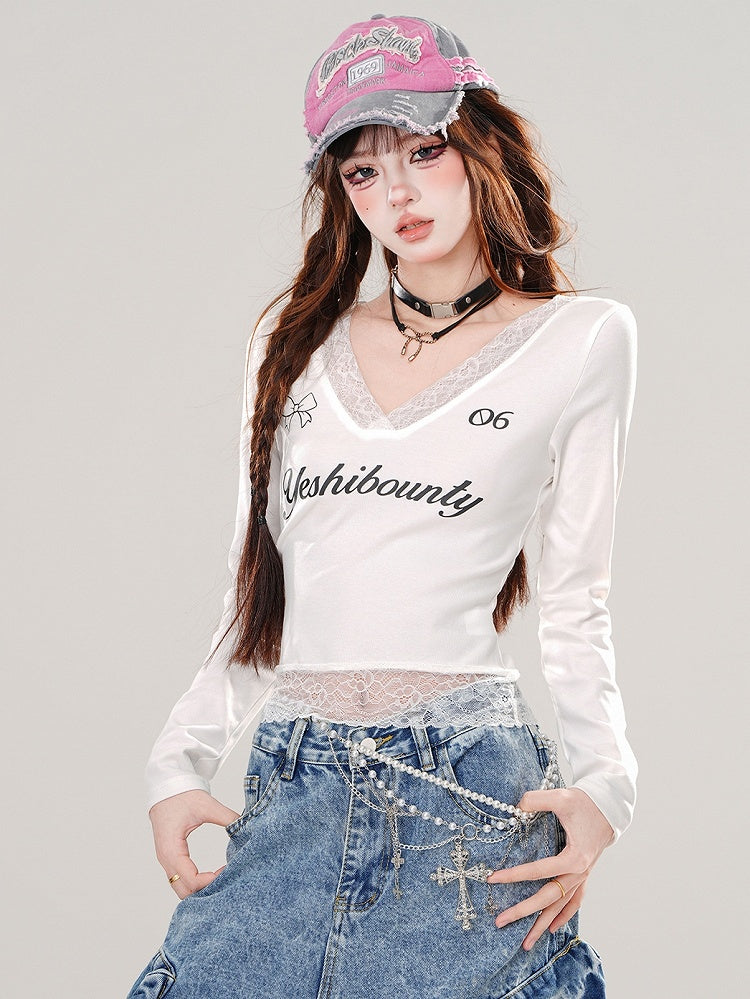 Weißes Spitzen-Patchwork-Oberteil mit V-Ausschnitt und langen Ärmeln