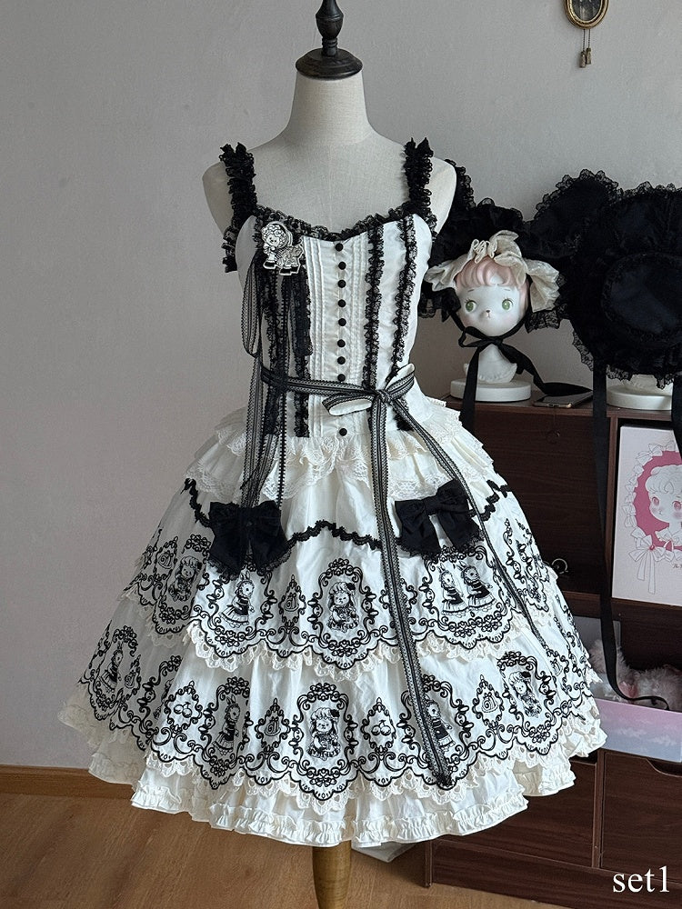 White & Black Elegant Lolita Camisole Top + Layered Scalloped Edge Trim Lolita Skirt with Rabbit Pattern Set