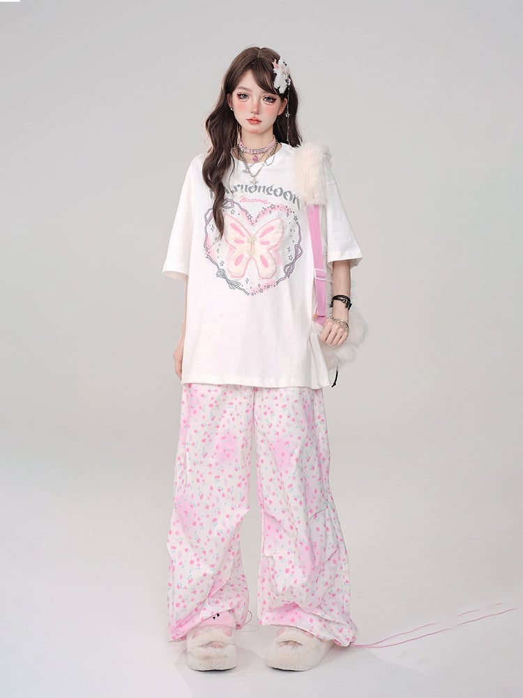 White Oversized Plush Large with Tee print Lettering Butterfly Embroidery