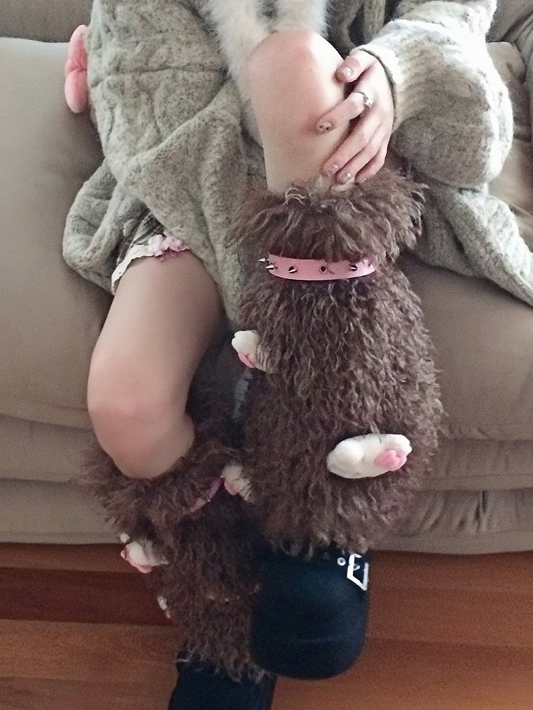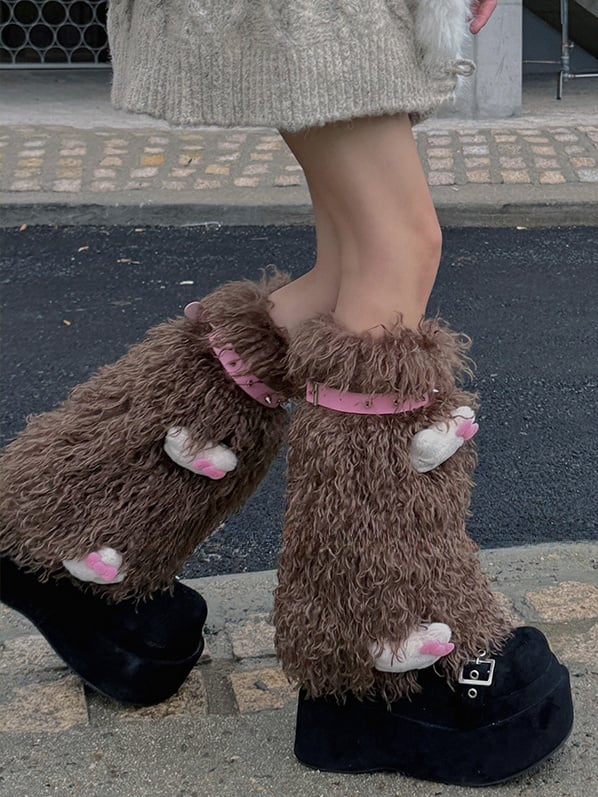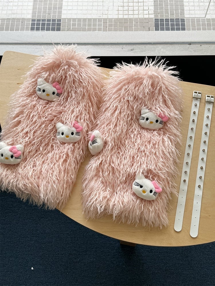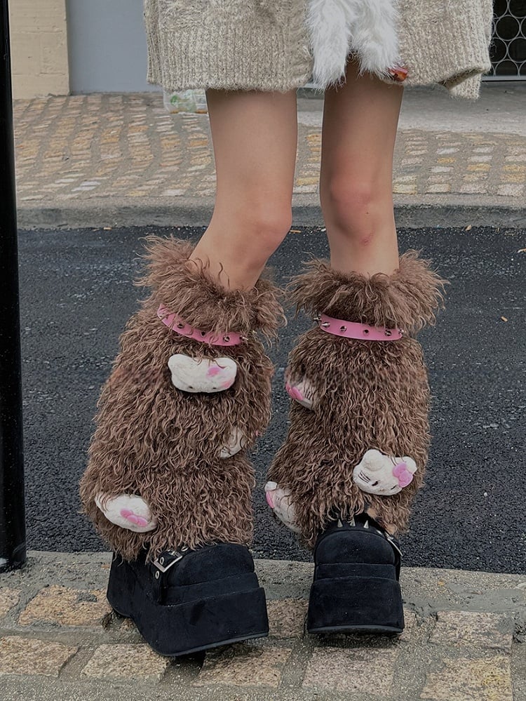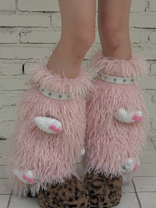 Weiß/Rosa/Kaffeebraune, zottelige Beinwärmer mit Nieten und Plüsch-Kätzchen