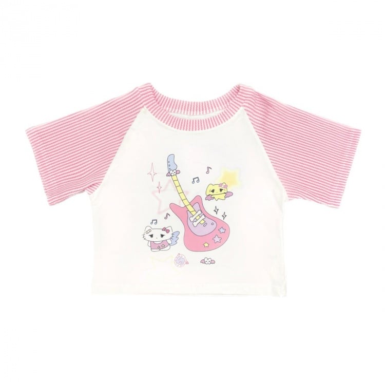 Weißes, rosa gestreiftes Crop-Top mit Kätzchen- und Gitarren-Print