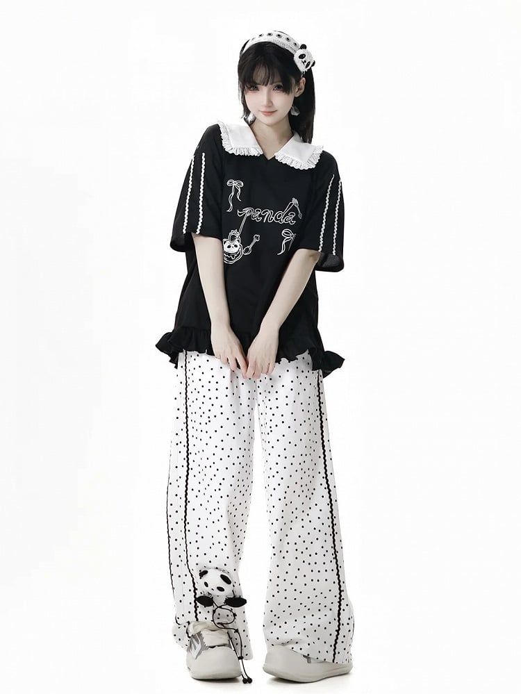 Weiße Baumwollhose mit geradem Bein und Punktemuster und Panda-Plüschtier