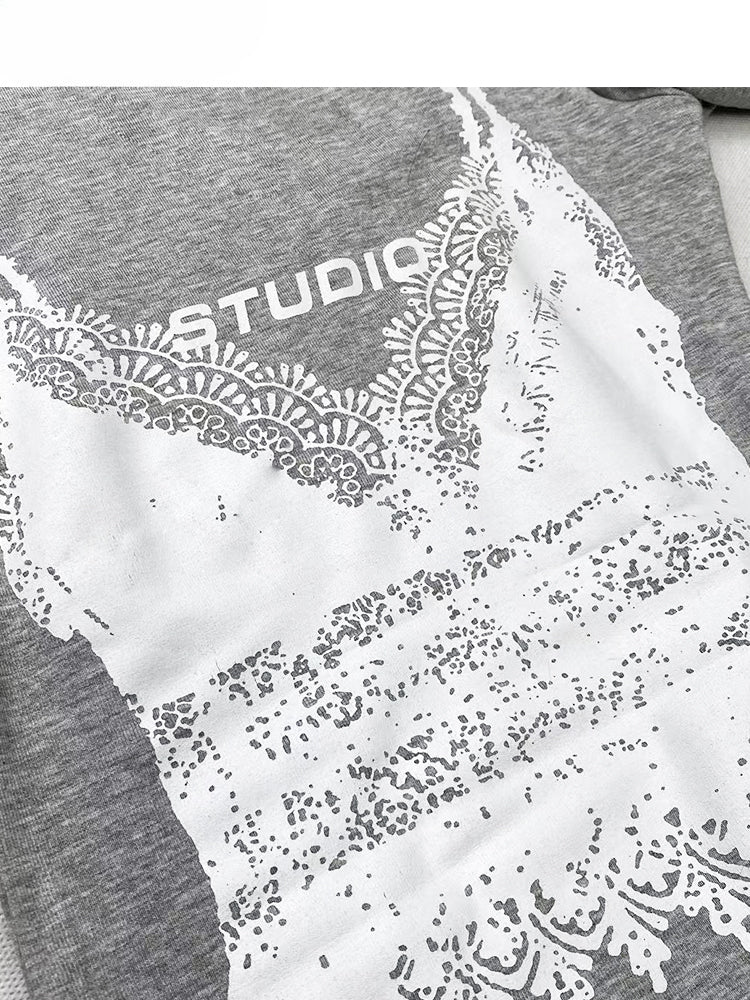 Weißes bedrucktes Spitzenbündchen-Top in Grau
