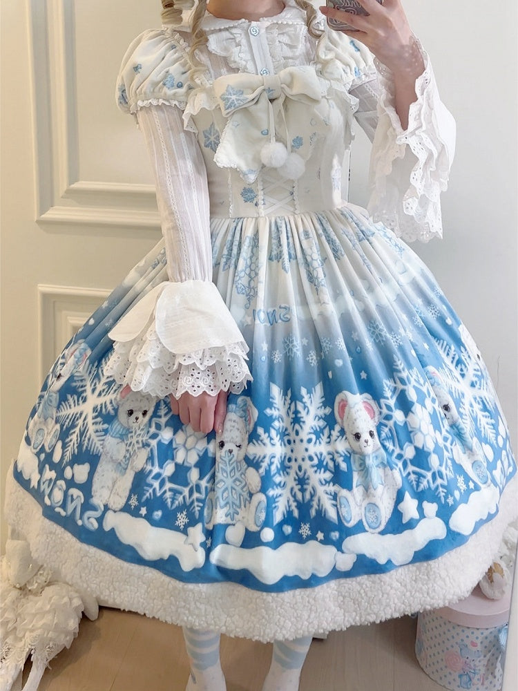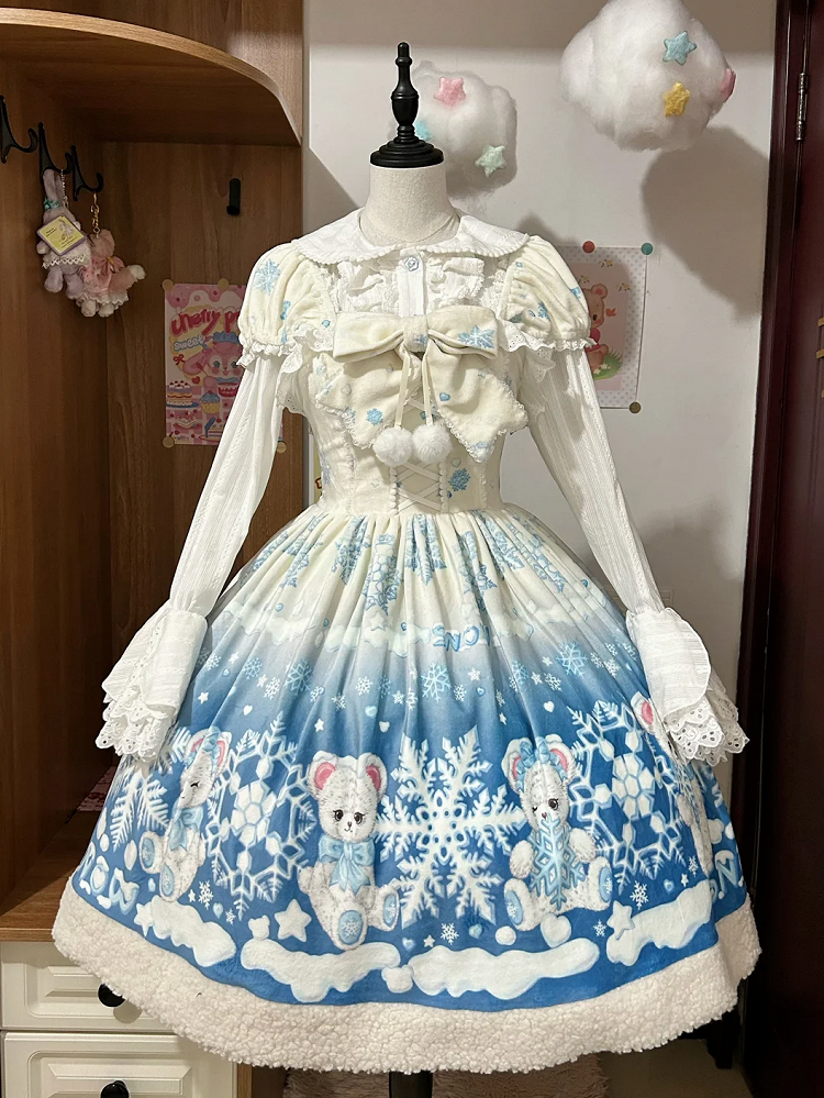 Blau-weißes Old School Lolita Fashion Kleid mit Schleife und Details, JSK-Set