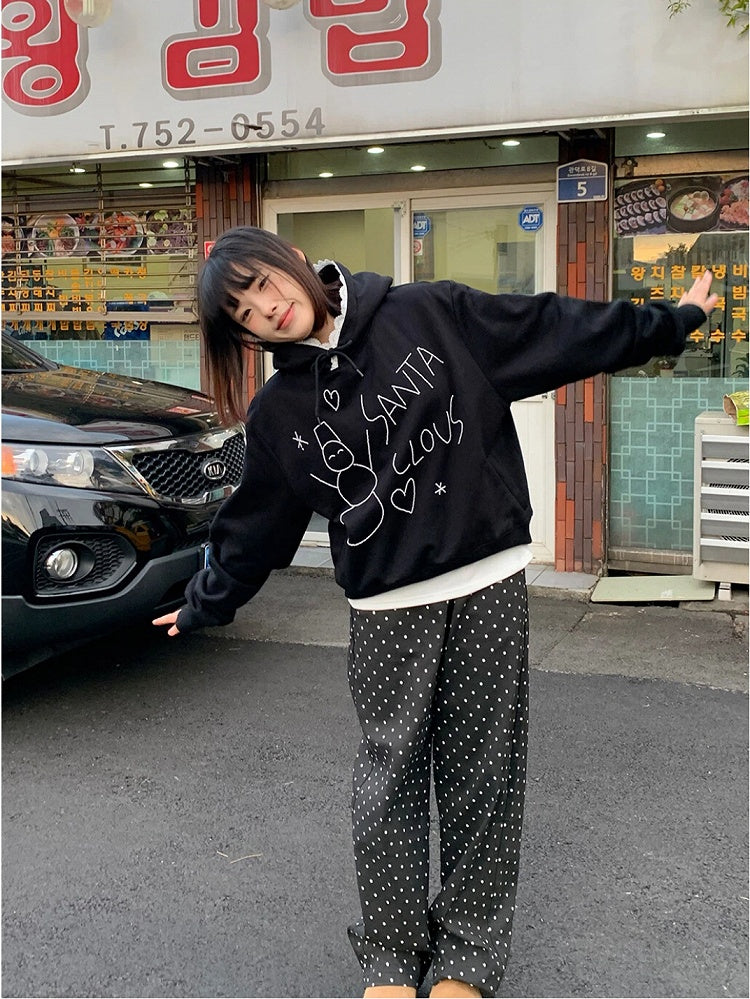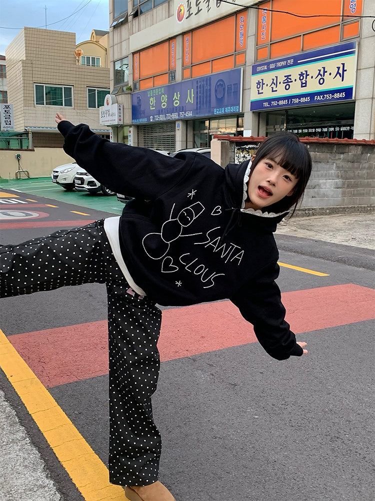 White / Black Fleece-Lined Hoodie with Snowman Bead and Lace-Trimmed Hood
