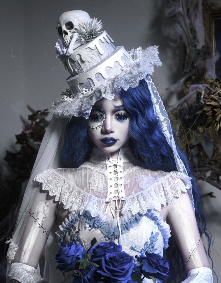 Blau-weißes Old School Lolita Fashion Kleid mit Schleife und Details, JSK-Set
