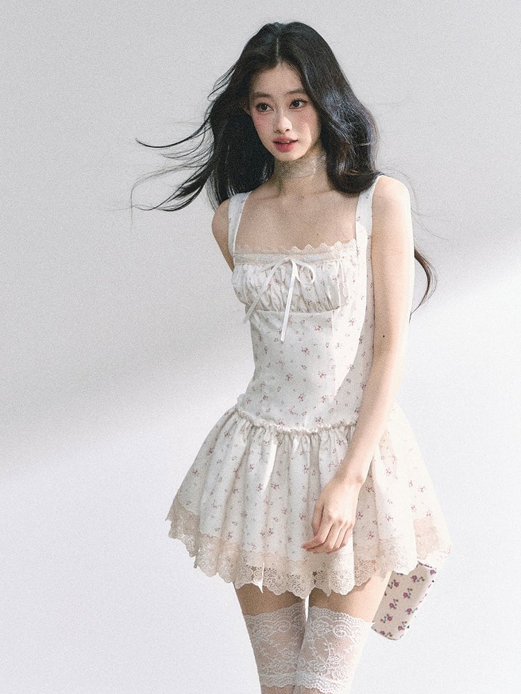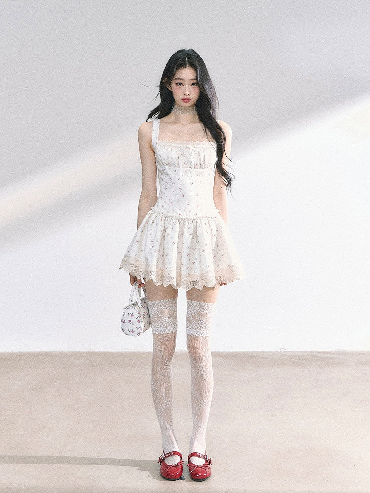 Weißes ärmelloses Kleid mit quadratischem Ausschnitt und Spitzenbesatz und Blumenmuster