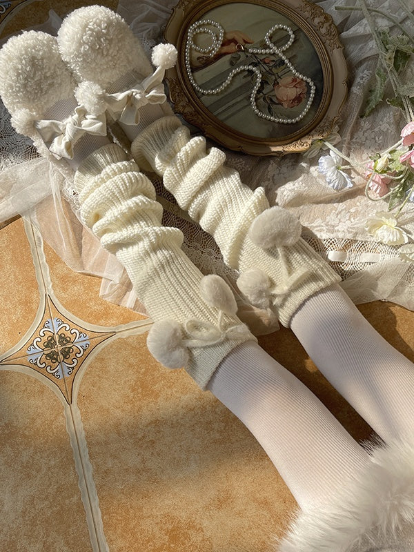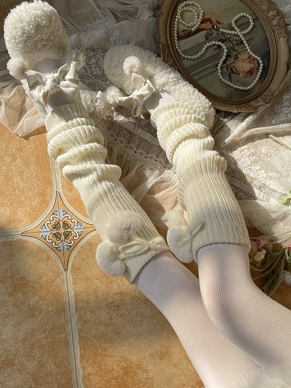 Weiße süße gestrickte Beinwärmer mit herzförmigen Pompons