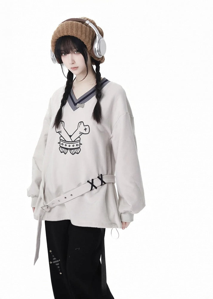 Weißes Sweatshirt mit süßem Knochenmuster und V-Ausschnitt