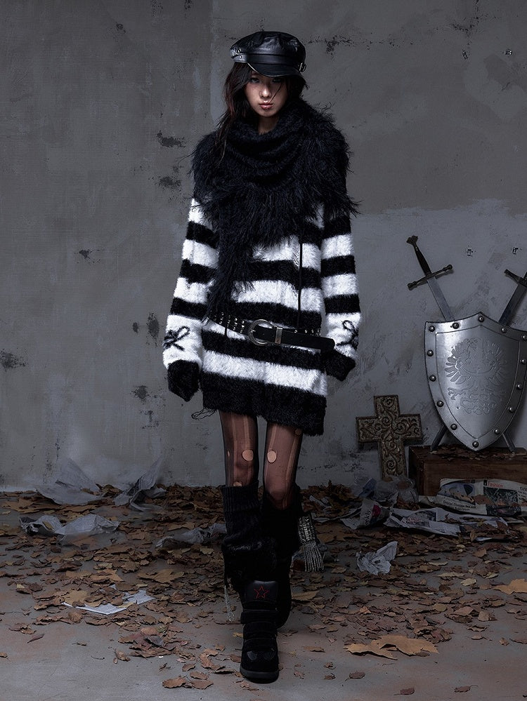 Vintage Punk Black & White Striped Distressed Long Sweater with Faux Mink Collar & Crisscross Lacing