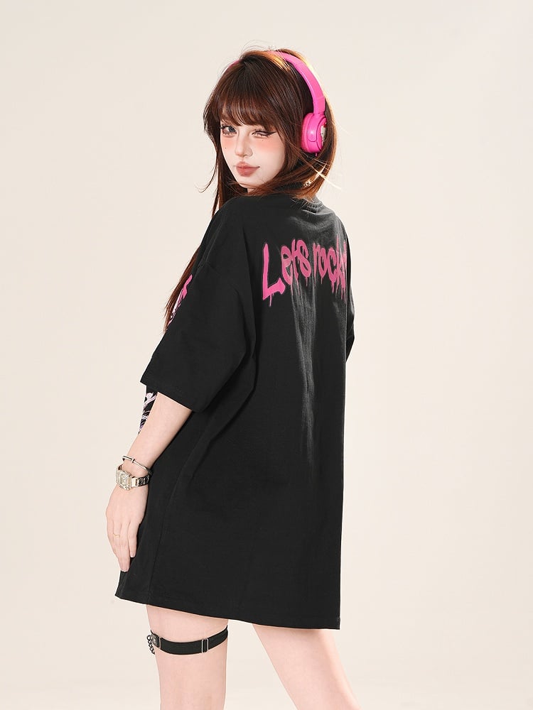 Weiß/Schwarzes lockeres T-Shirt mit Rundhalsausschnitt und Anime-Mädchen-Print