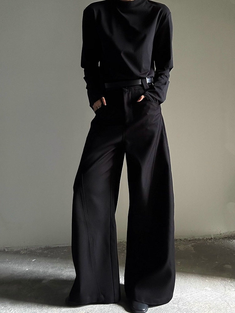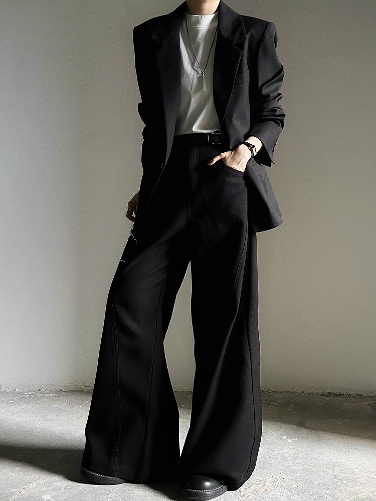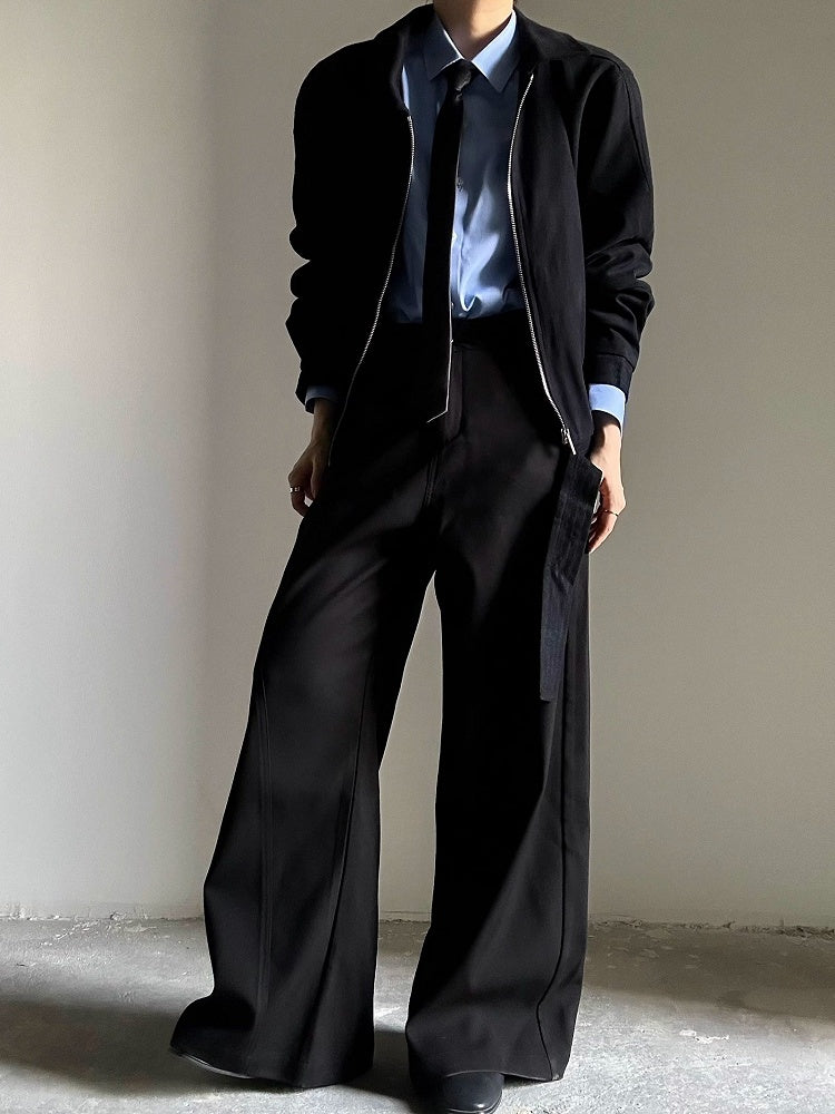 ● Button Closure and Zip Fly / Slant Front Pockets / Wide-leg Cut