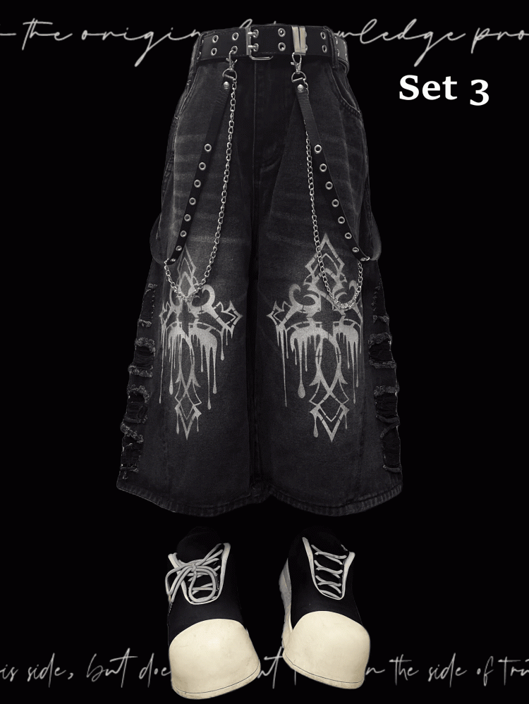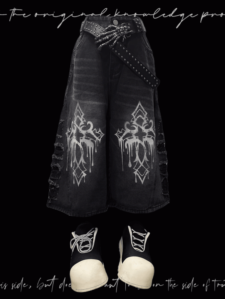 Weite Jeans mit Saum, dunkelgrau, Kreuzdruck, Distressed-Löcher