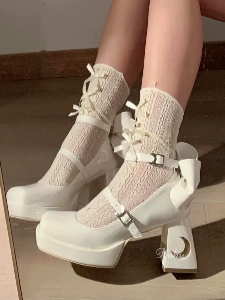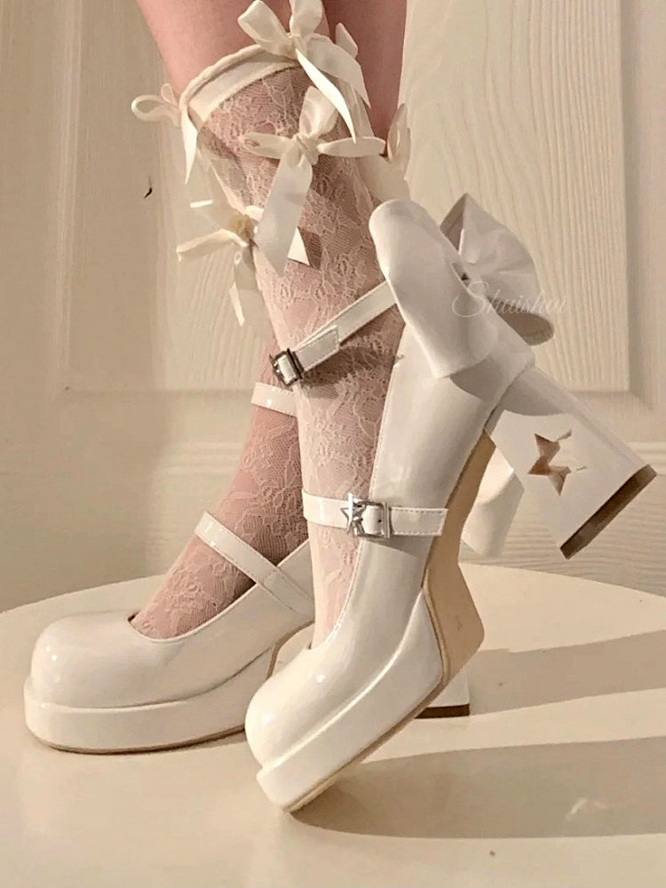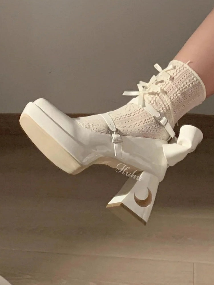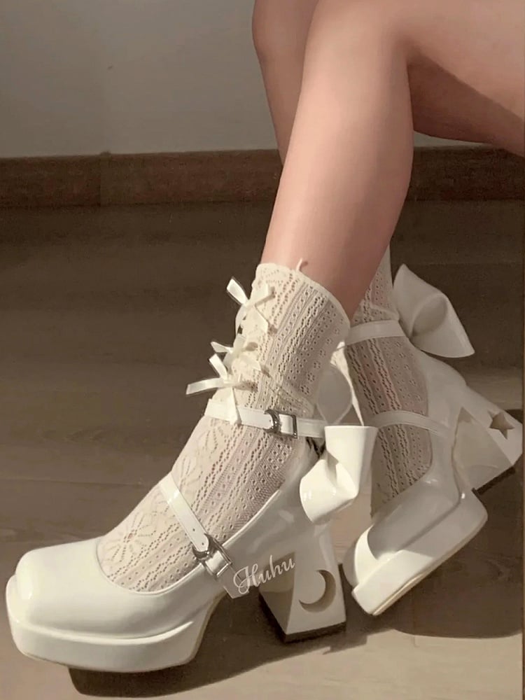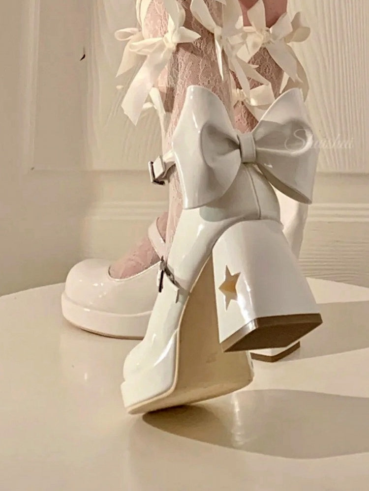 Weiße Blockabsätze mit Astral-Motiv – Y2K-Plateaus mit himmlischen Ausschnitten und Schleife auf der Rückseite