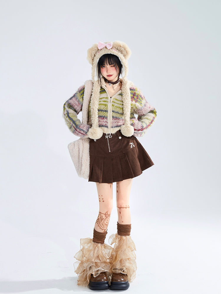 mit Cardigan Mohair Verschluss Vintage Gestreift Reißverschluss High Neck Crop Grün