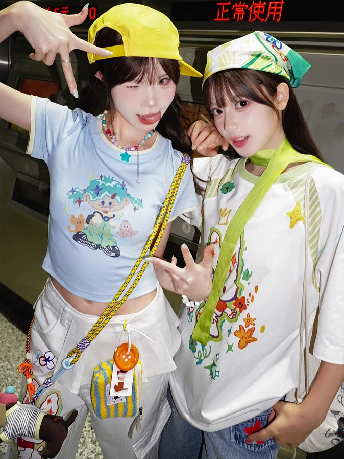 mit Halskette Cartoon Mädchen Print Blau Rundhals Cropped T-shirt Kostenlos