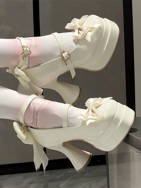Sweet Lolita White Round-Toe Platform High Heels with Bow Accents
