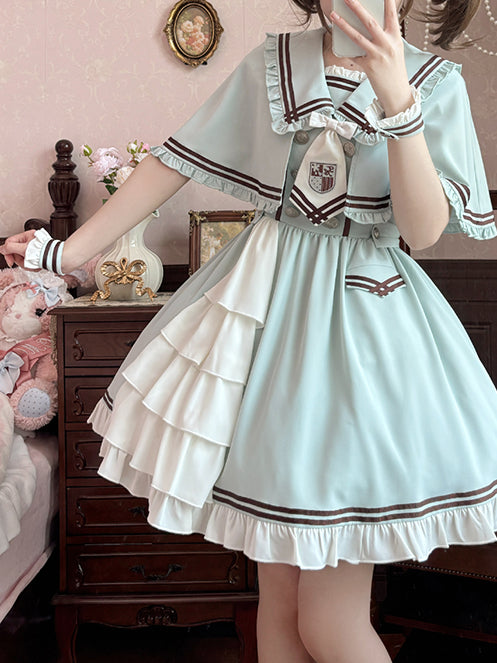Blau-weißes Old School Lolita Fashion Kleid mit Schleife und Details, JSK-Set