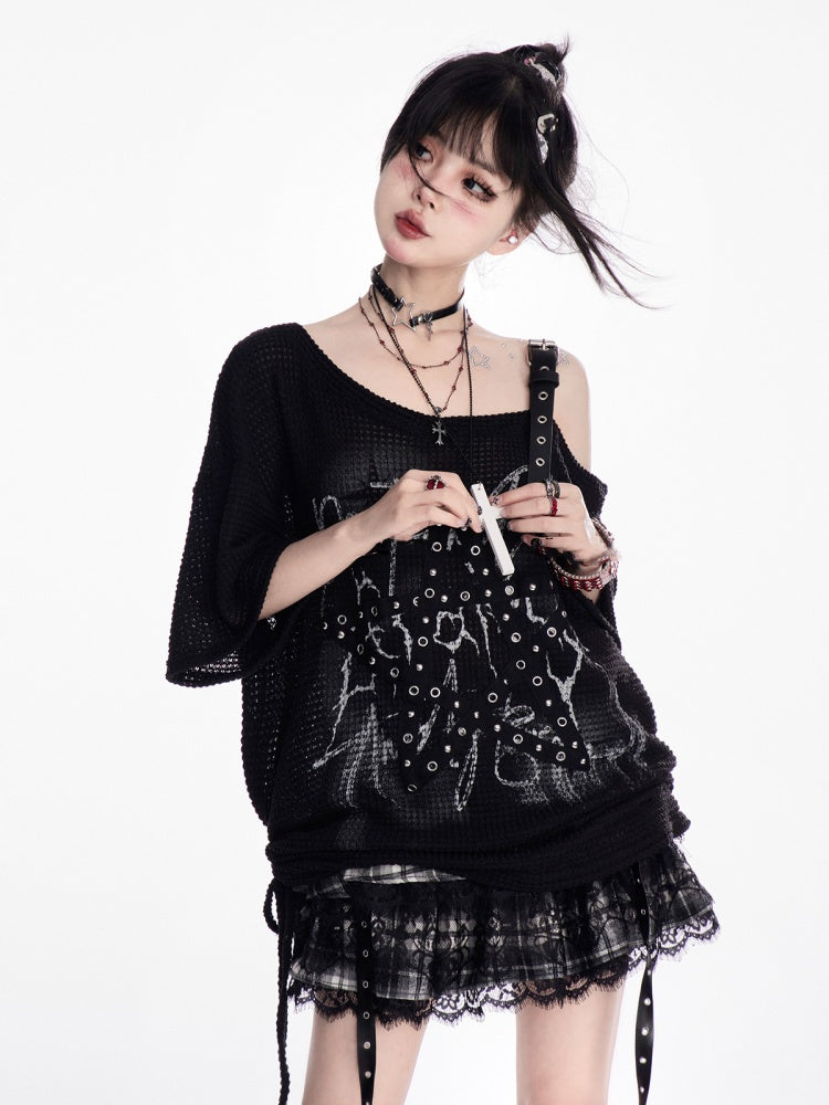 Y2K Schwarzes, asymmetrisches T-Shirt mit Sternträgern und Bittersüß