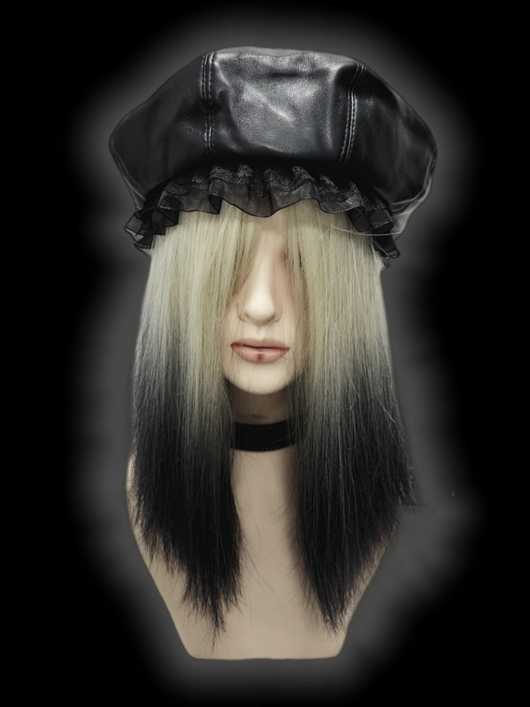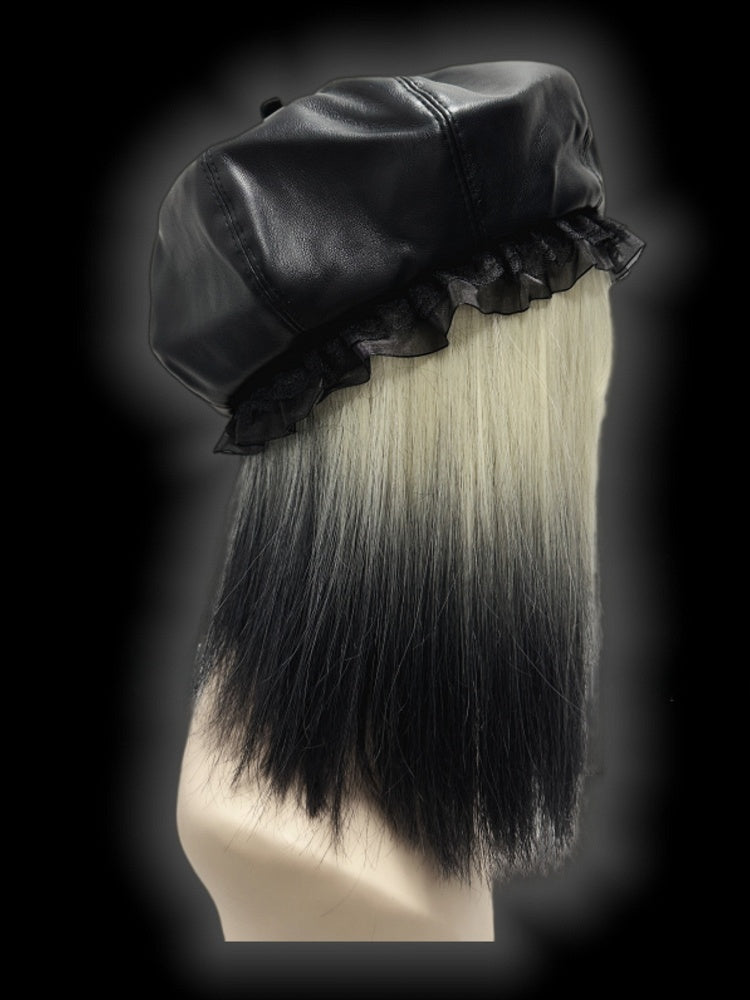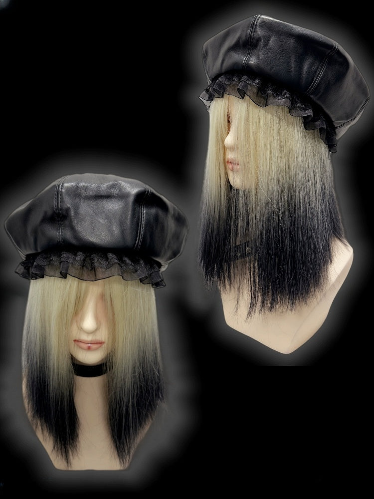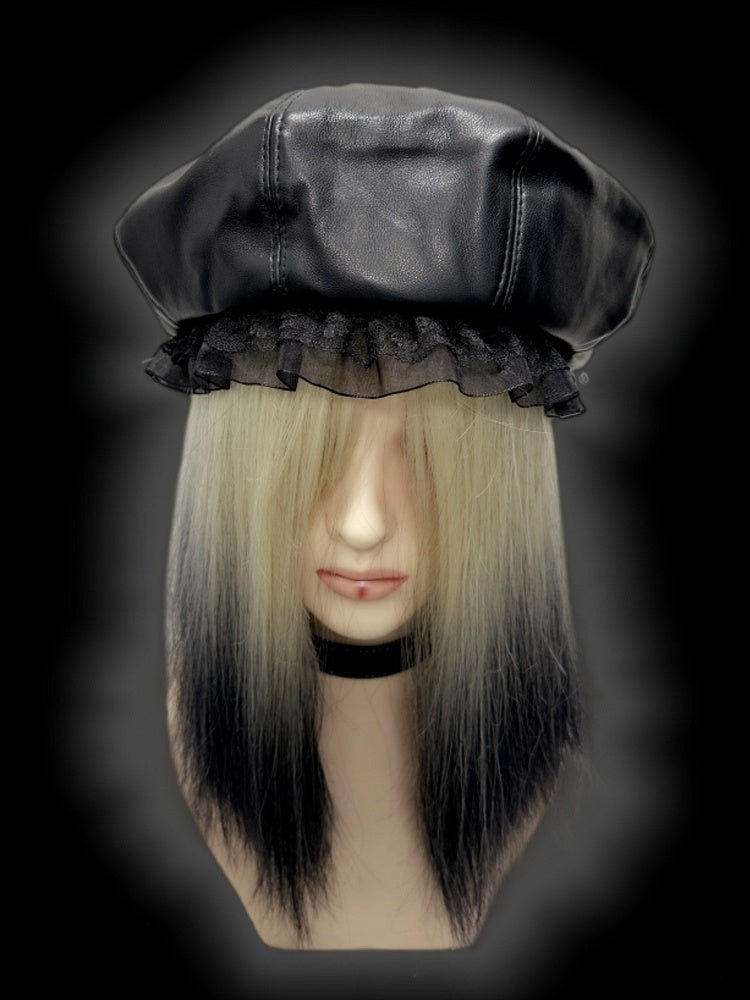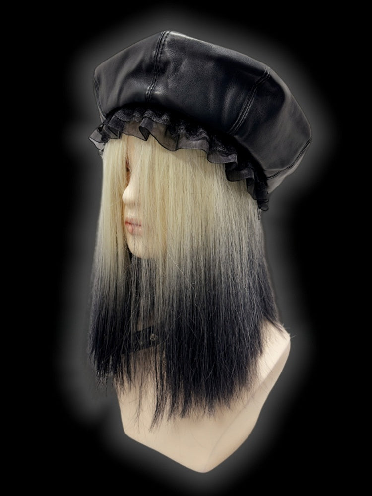 Schwarze Baskenmütze aus PU im Y2K-Stil mit Spitzenbesatz