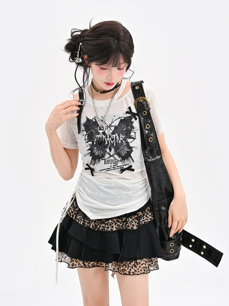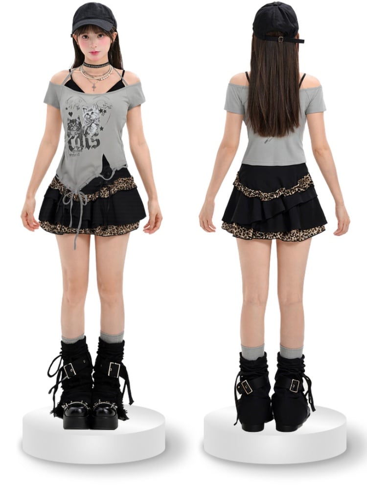 Y2K Glamouröser Mini-Stufenrock mit schwarzem Leopardenmuster und Schnürdetails