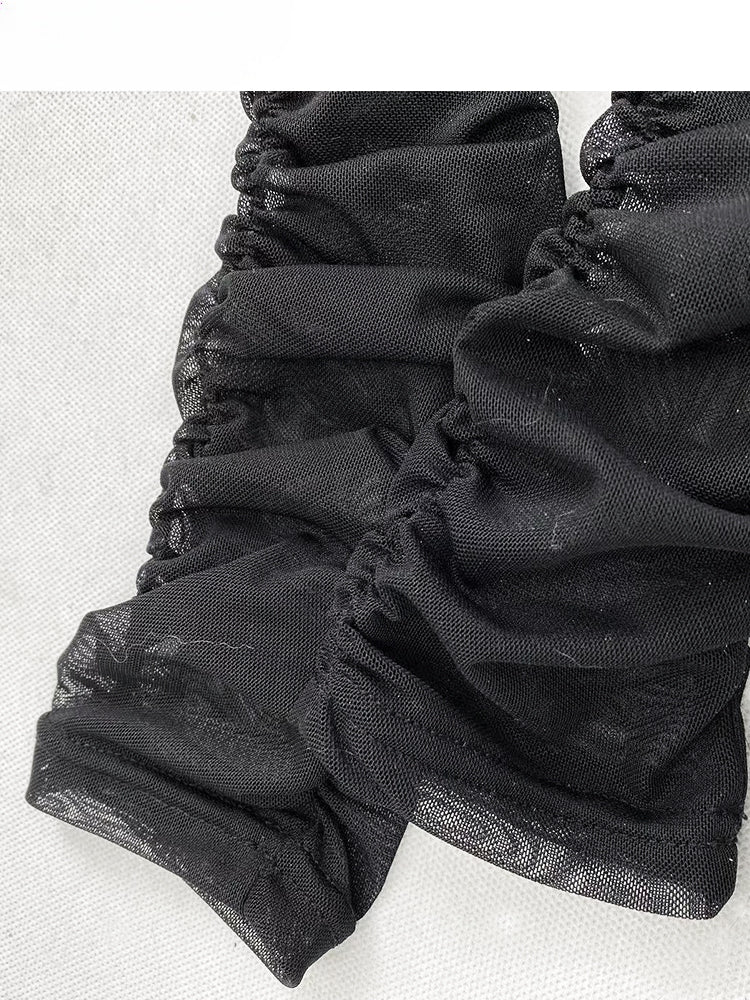 Y2K Schwarzes, halbtransparentes Top mit Rundhalsausschnitt und Rüschenärmeln, glamouröses Grafik-Top