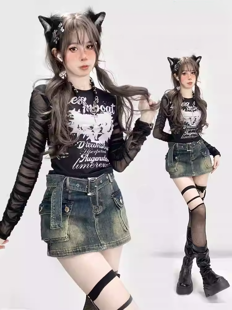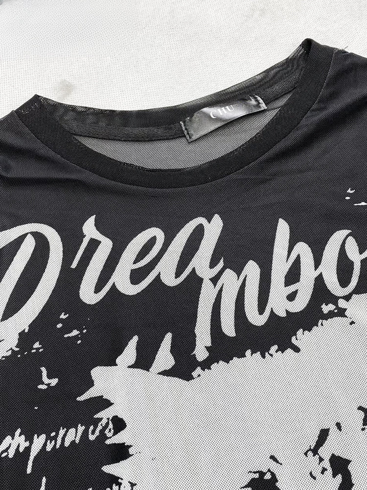 Machen Sie sich bereit für einen atemberaubenden Auftritt in diesem schwarzen, halbtransparenten Y2K-Top mit Rundhalsausschnitt, Rüschenärmeln und glamouröser Grafik. Dank des leichten und atmungsaktiven Materials bleiben Sie bequem und zeigen gleichzeitig Ihren einzigartigen Stil. Die Rüschenärmel verleihen diesem schicken Top eine süße Note.