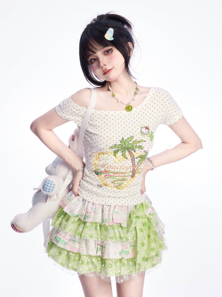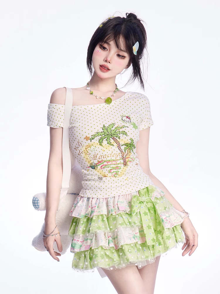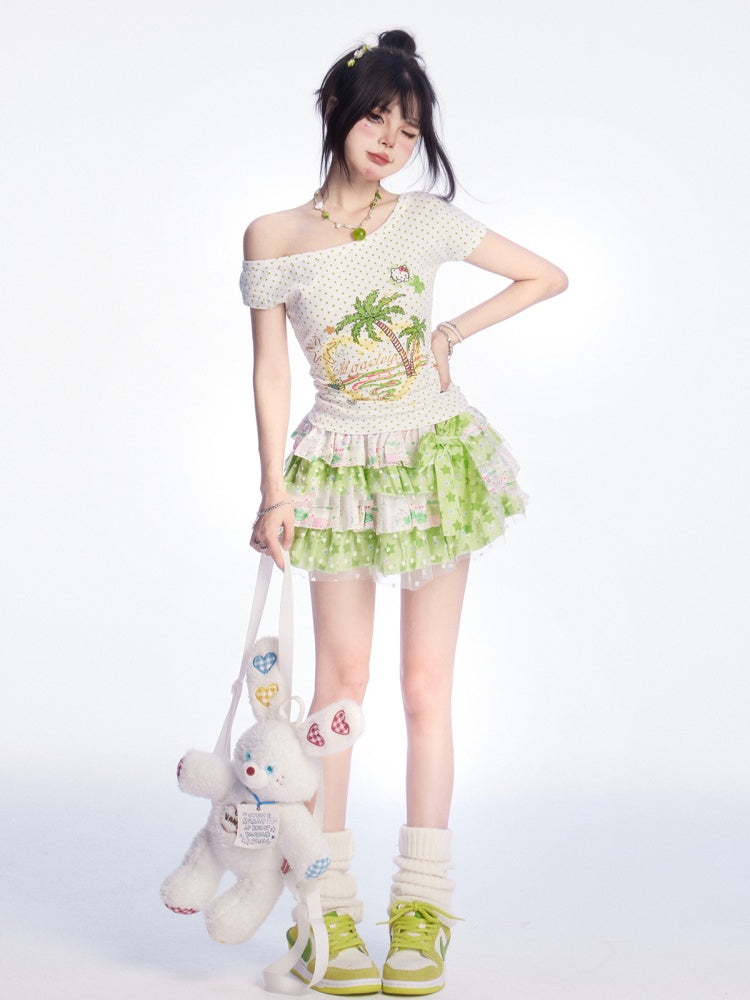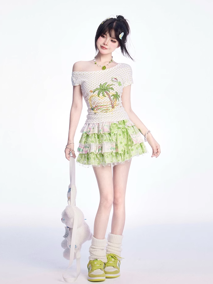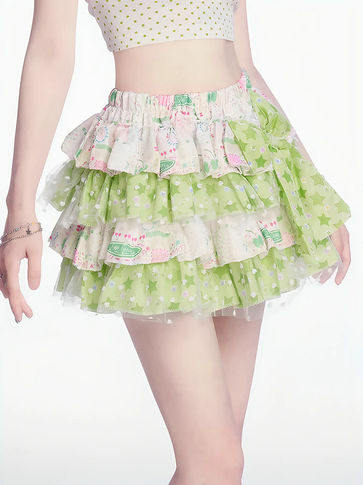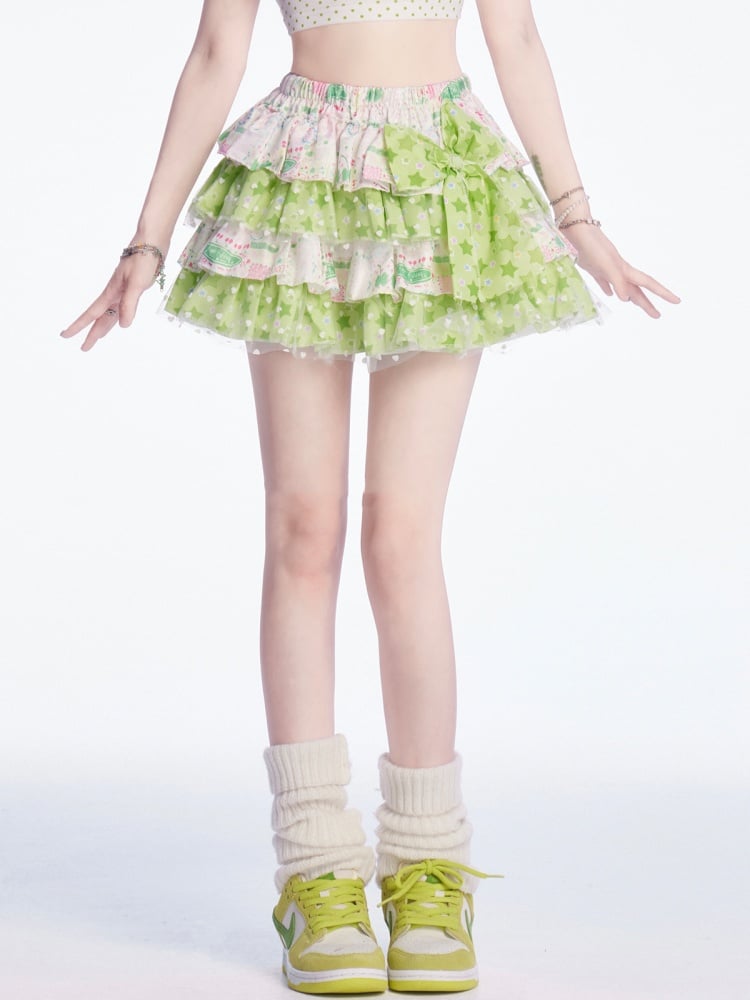 Y2K Grüner Stufenrock mit großer Schleife und elastischer Taille