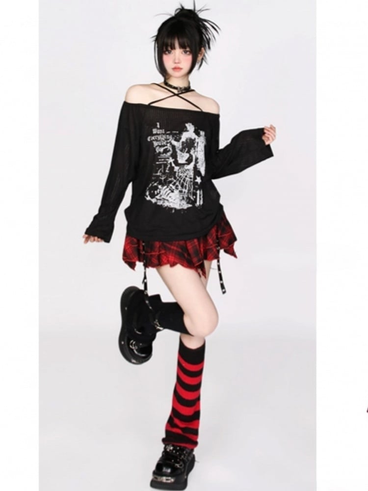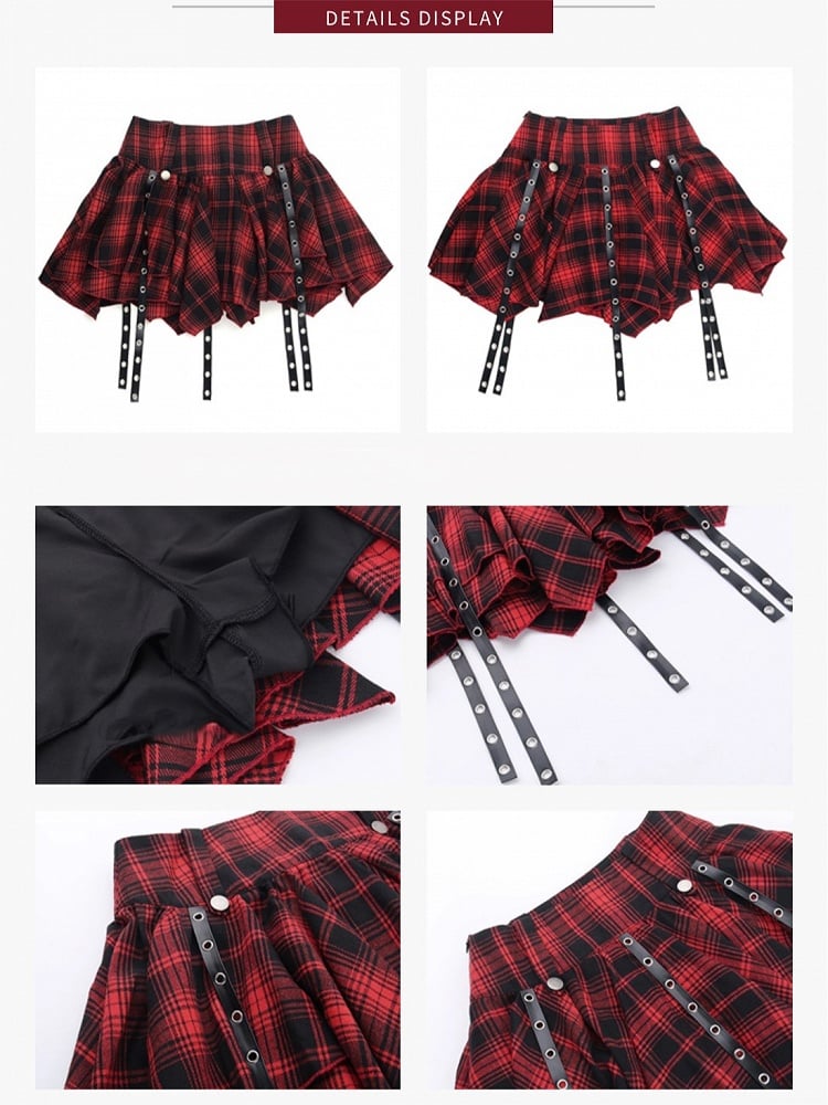 Y2K Rot karierter Minirock - Stufenrock mit hängenden Gürtelakzenten