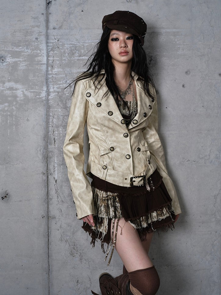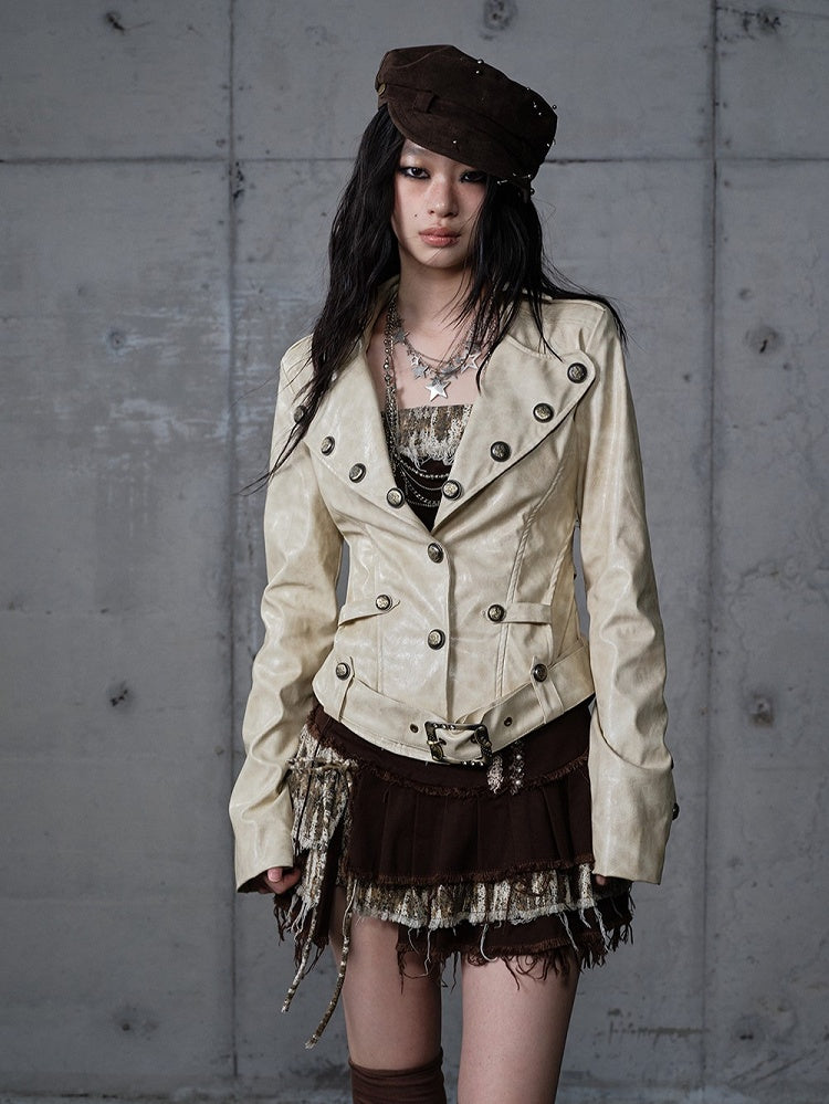 Gelbe Gürtelrose-Jacke mit Punk-Schnallenstickerei, kurz geschnitten, Khaki