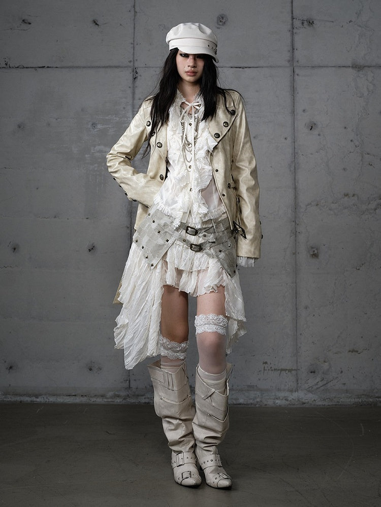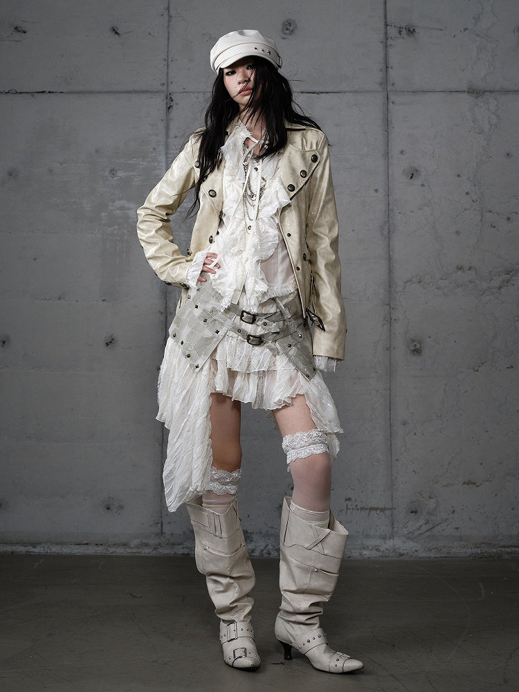 Maßgeschneiderte, kurze Punk-Jacke in Khakigelb mit Rosenstickerei und Schnallengürtel