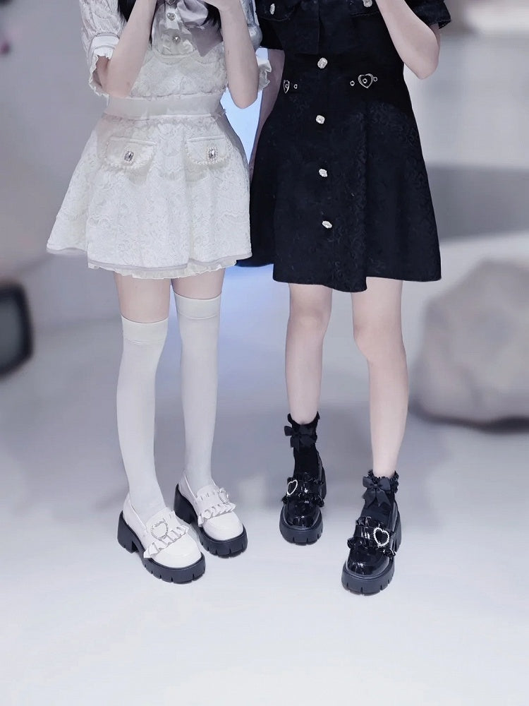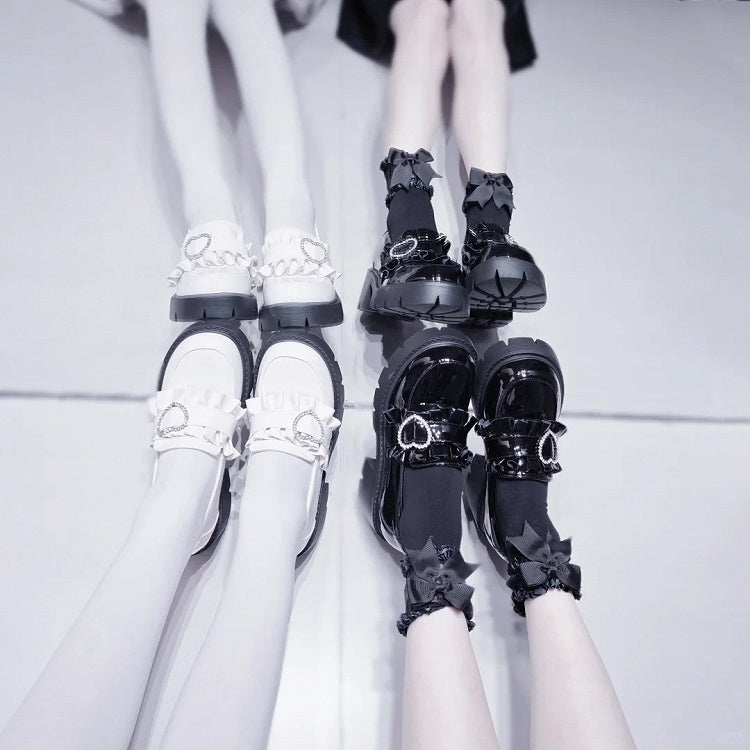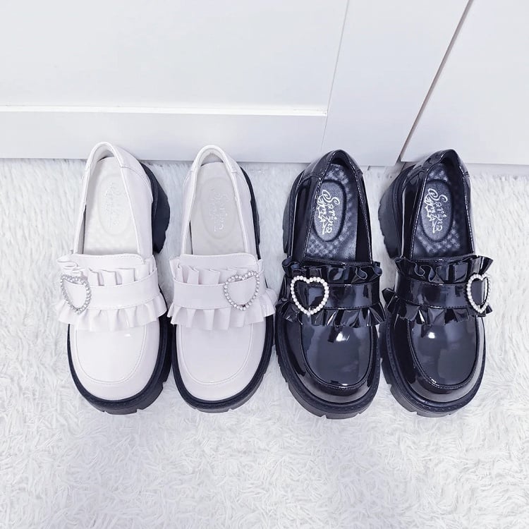 6.5cm White Chunky with Sweetheart Detail Kei Platform Heel Loafers Beaded Jirai