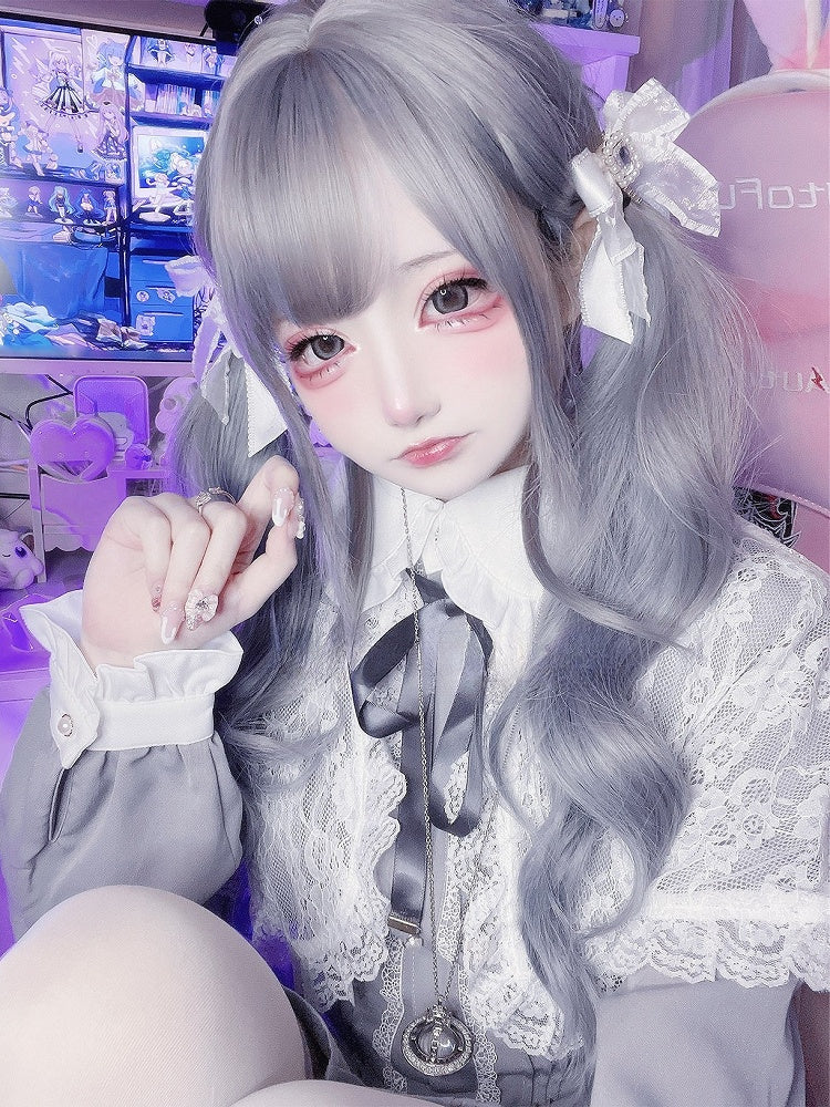 グレーとブルーのオンブレ、長さ65cmのウェーブウィッグ(エアバング付き)