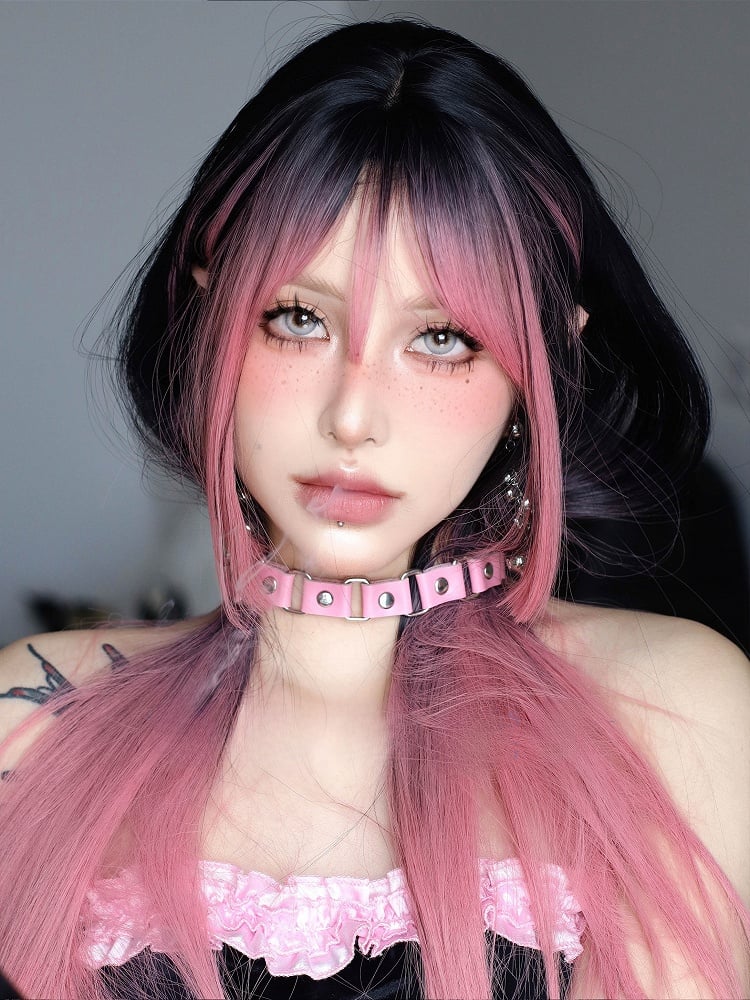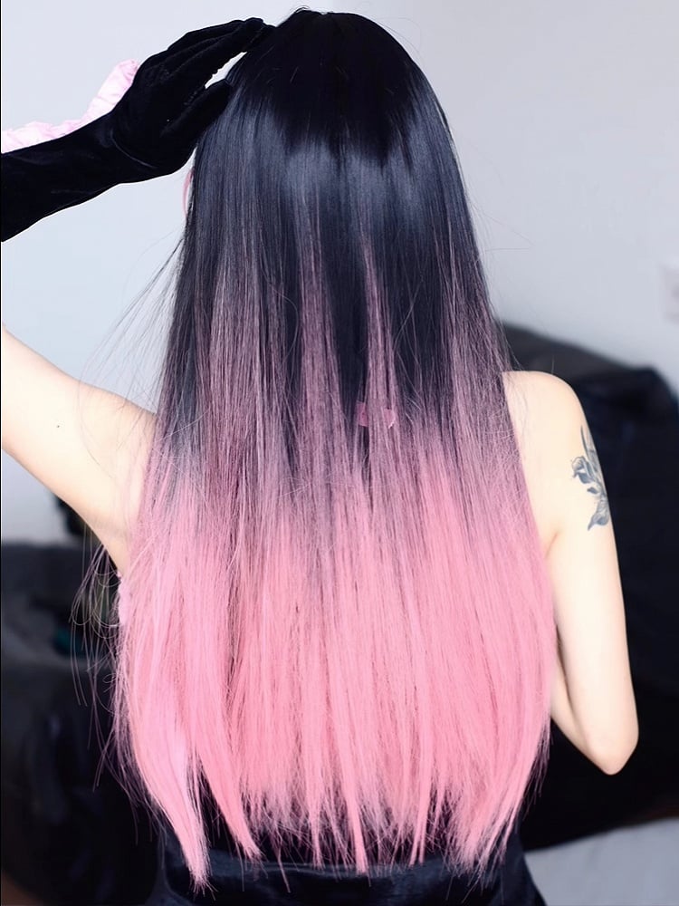 ピンクと黒のオンブレ 68cm ストレートウィッグ(エアバング付き)